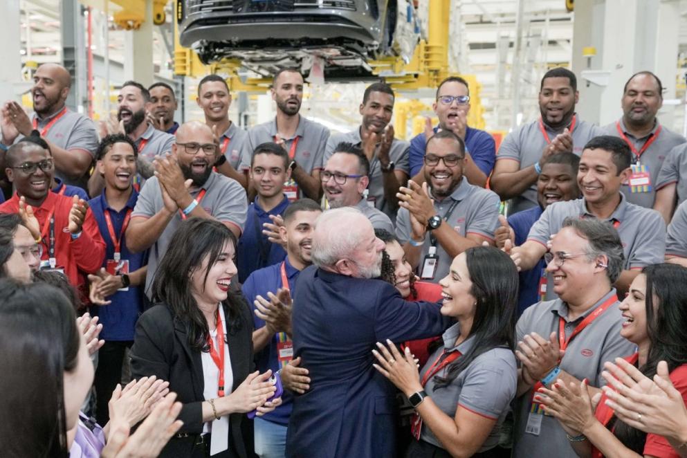 巴西总统卢拉、比亚迪董事长兼总裁王传福与比亚迪巴西卡马萨里工厂员工合影