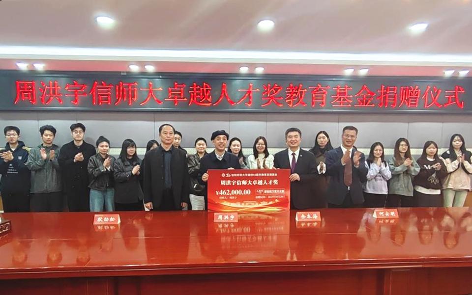 10月28日,信阳师范大学举行周洪宇信师大卓越人才奖教育基金捐赠仪式。全国人大常委会委员、湖北省人大常委会原副主任、中国教育学会副会长、信阳师范大学特聘教授周洪宇,校长余本海出席仪式。对外联络办公室负责人,教育科学学院教师及研究生代表参加仪式。仪式由教育科学学院负责人主持。