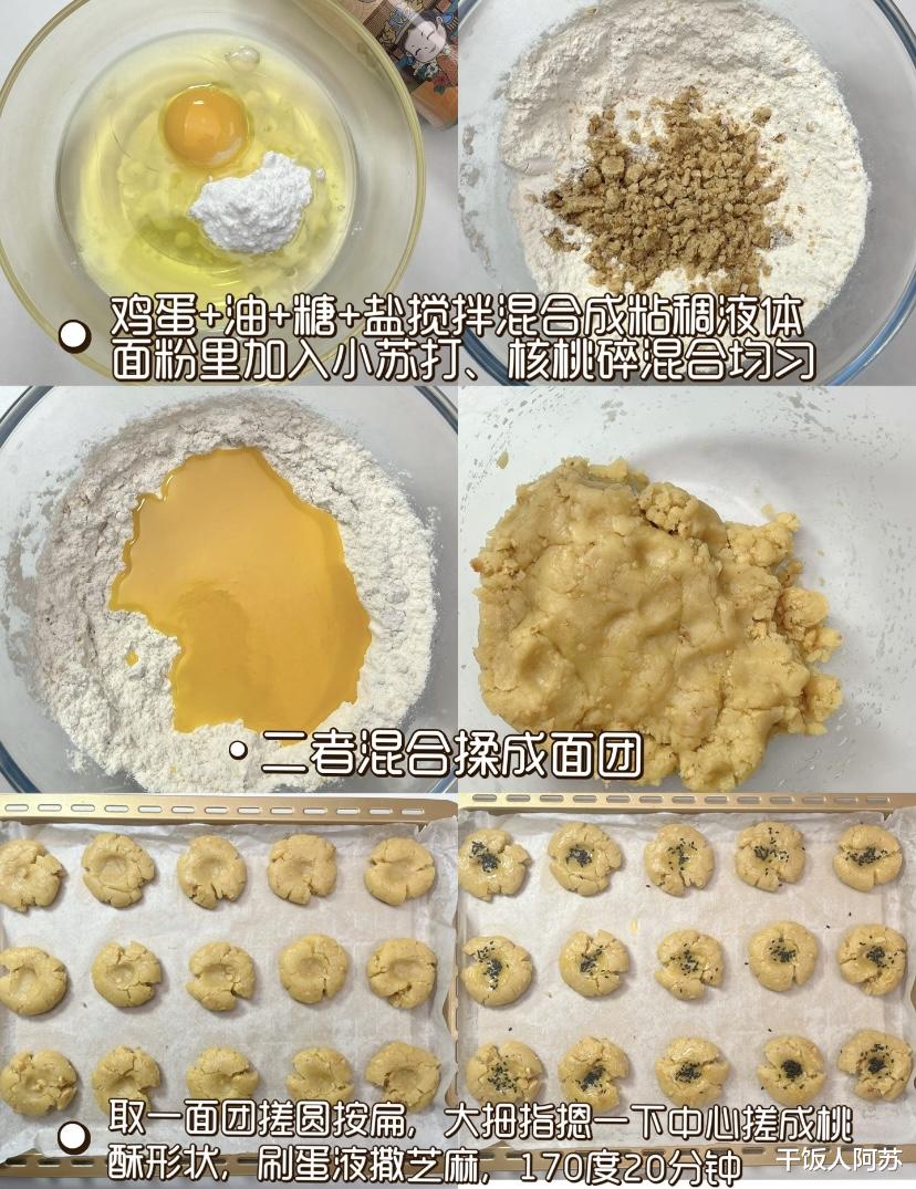 做桃酥的第一步,是准备好食材。核心食材很简单:普通中筋面粉、鸡蛋、玉米油(或无味的植物油)、白砂糖、盐、小苏打,还有灵魂配料——核桃碎。面粉选家里常用的就行,不用特意买低筋或高筋;核桃要提前用烤箱或平底锅小火烘香,再切成碎粒,颗粒感不用太细,保留一点嚼劲才更有风味。
