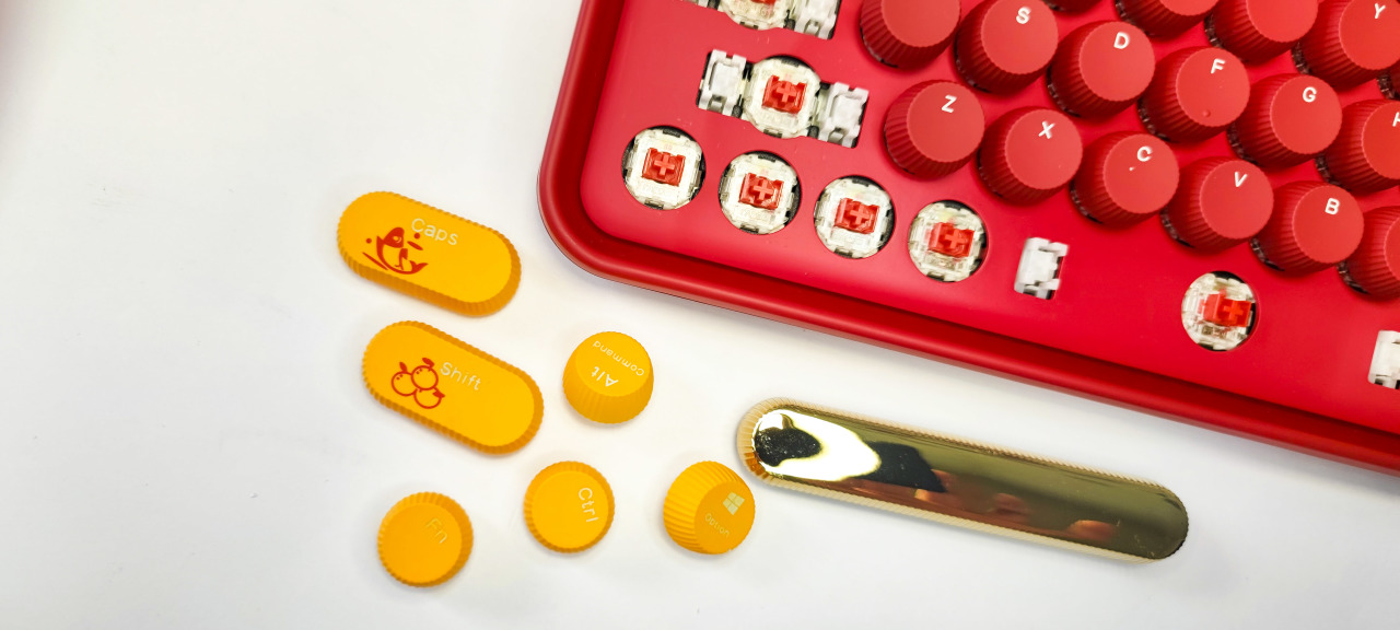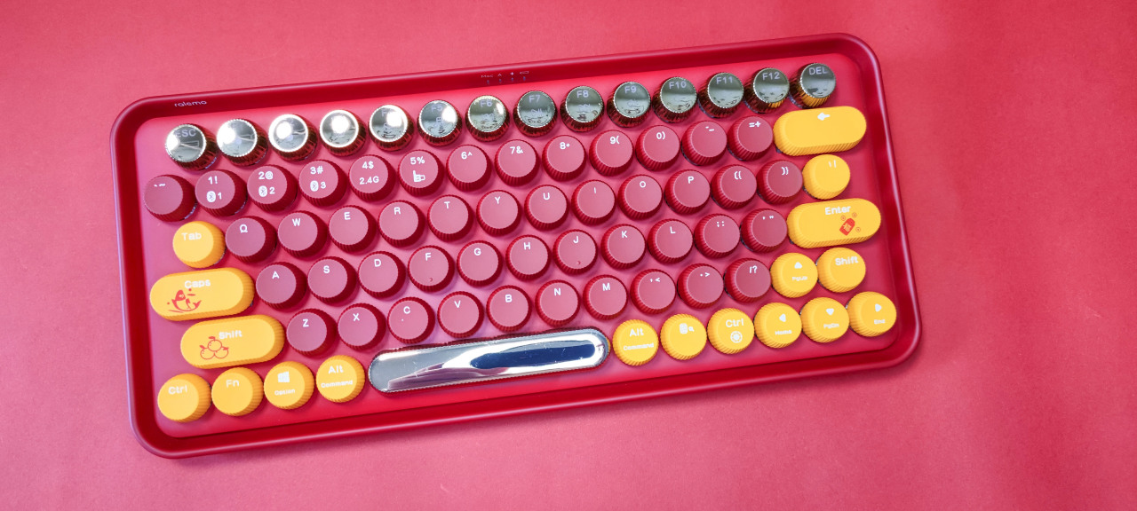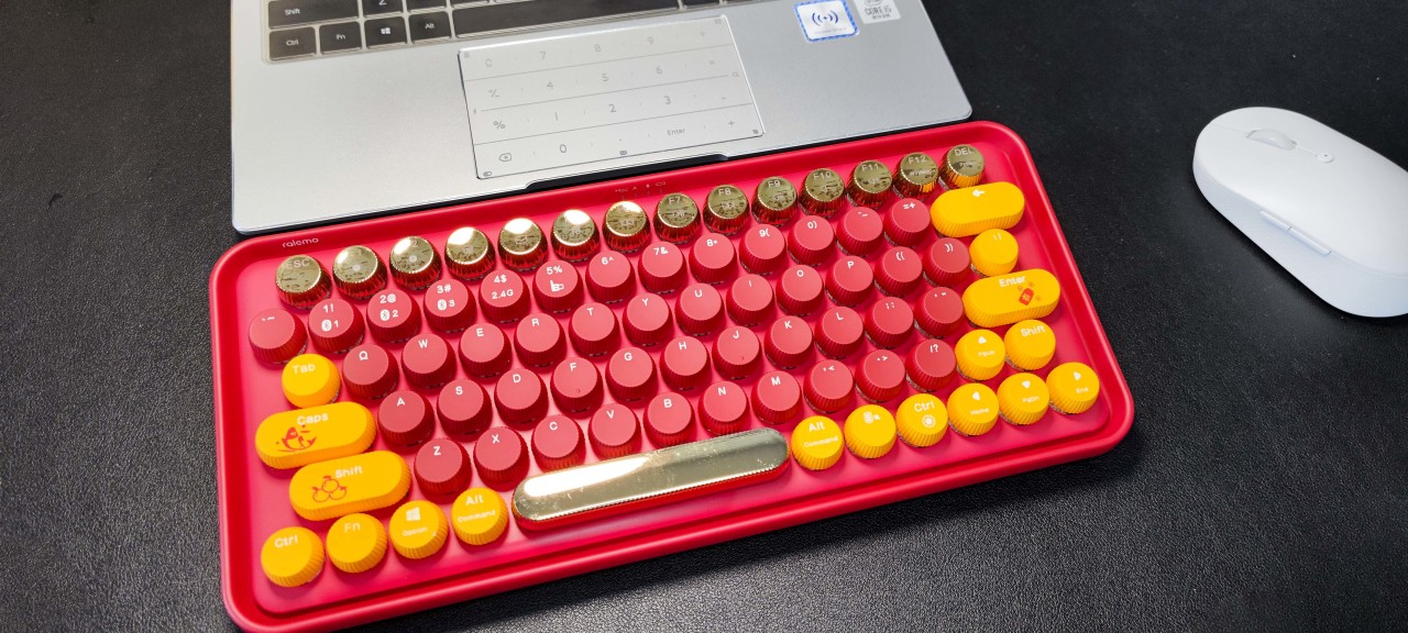 “新女性 Ralemo”无论是从颜色还是尺寸方面来说,厂家都针对女性用户进行了优化,更加符合女性用户的喜好。在配色方面,除了常规的冰雪白、曼妙紫、知性蓝和微醺紫外,厂家还推出了彩妆定制款“姹紫嫣红”和“胭红彩韵”、情人节定制款“心花怒放”、圣诞节定制款“绿野星踪”和春节定制款“流金岁月”,每一款都可以击中女性用户的心窝。这次我入手的是春节定制款“流金岁月”,热烈喜庆的中国红,缀上电镀金边,糅合中国的典雅美感,期许福禧双全。配件方面,除了键盘和说明书外,还包含了2.4G接收器以及数据线(电源线)。
