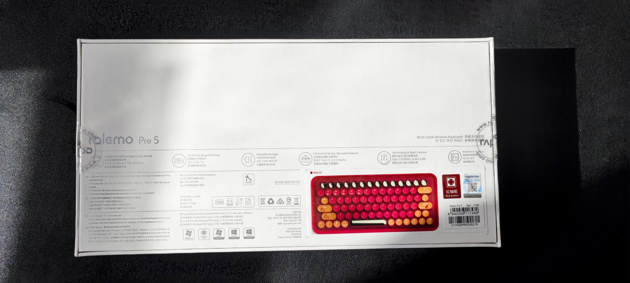 雷柏 ralemo Pre 5 多模无线机械键盘有黑轴、蓝轴、茶轴和红轴共计四个键轴版本,这次入手的是红轴版。每个键轴上都印有雷柏的Logo,雷柏自主办公机械红轴,相较于蓝轴和茶轴而言,几乎没有段落感,1.2±0.5mm的键程,可实时快速响应,手感轻柔持久,可以带来更加可靠稳定的操作。键盘敲击力度及声音反馈较弱,声音相对安静,无论是办公还是游戏都是不错的选择。