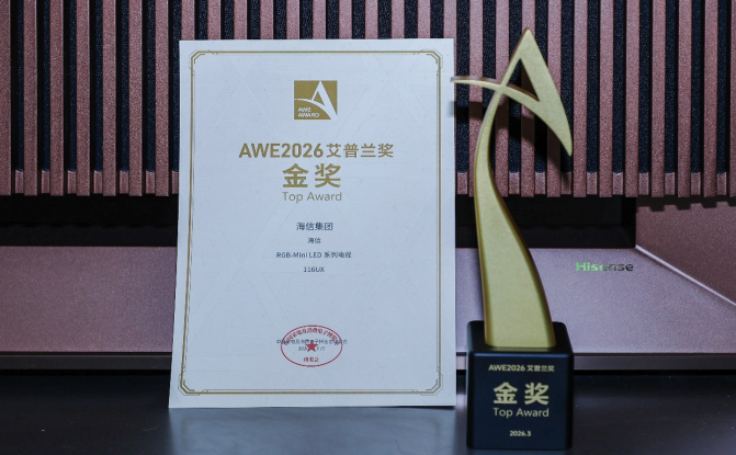3月12日,中国家电及消费电子博览会(AWE2026)艾普兰奖评选结果正式揭晓,海信最新发布的RGB-Mini LED超旗舰电视UX2026款凭借7大全球首创科技,打破行业技术瓶颈,推动液晶显示技术实现极致画质、视觉舒适、绿色节能的全面进步,成功斩获艾普兰奖金奖。