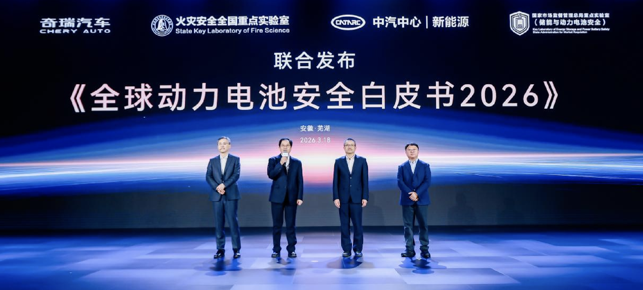 在活动现场,奇瑞还携手火灾安全全国重点实验室、中汽中心丨新能源、国家市场监督管理总局重点实验室(储能与动力电池安全)等权威单位,联合发布了《全球动力电池安全白皮书2026》。