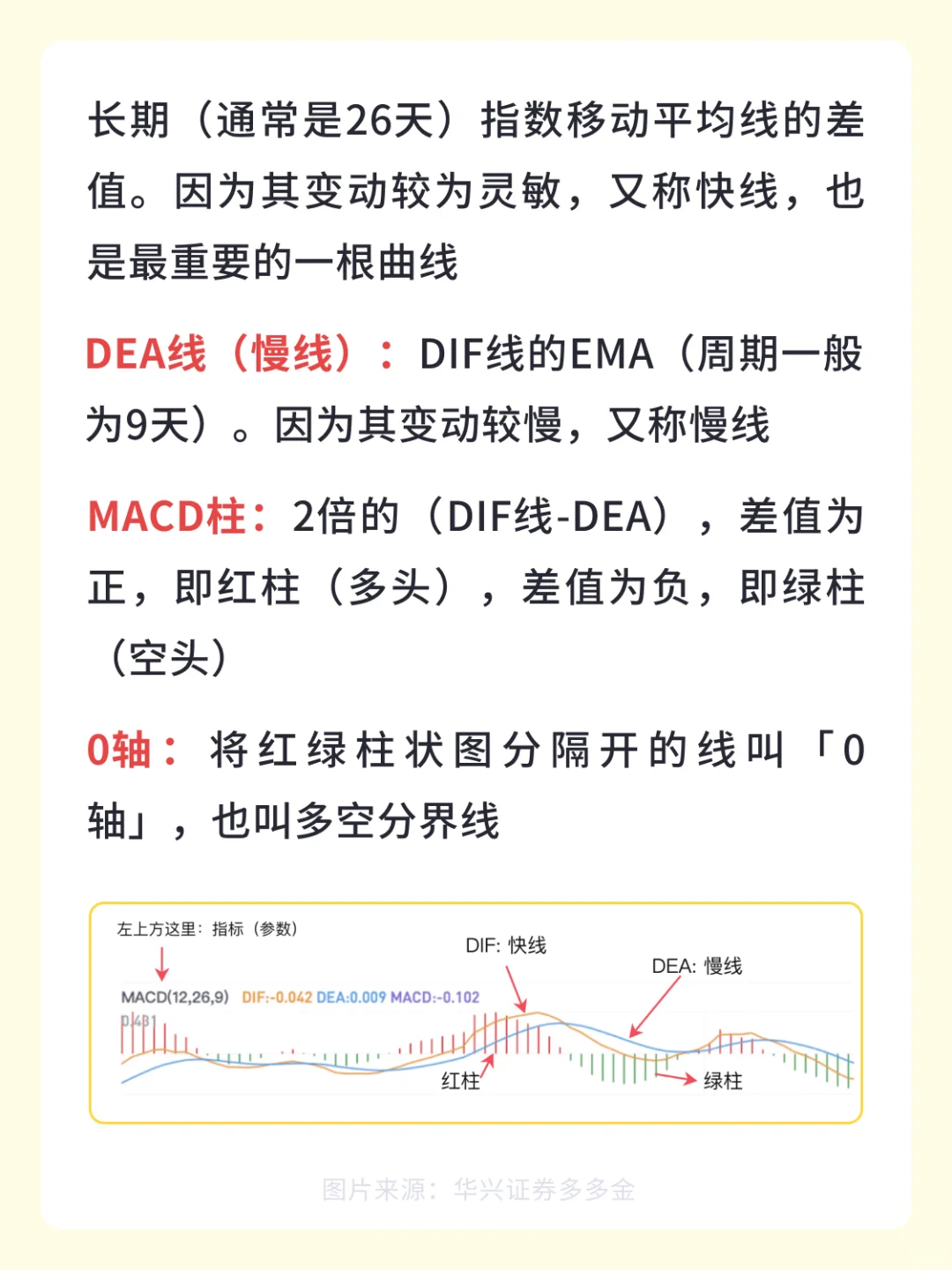 1⃣️MACD由一根快线(DIF)和一根慢线(DEA),以及红绿两种柱状图和0轴构成: