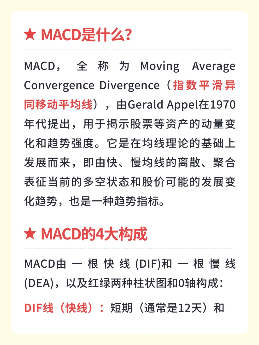 MACD,全称为Moving Average Convergence Divergence(指数平滑异同移动平均线),由Gerald Appel在1970年代提出,用于揭示股票等资产的动量变化和趋势强度。它是在均线理论的基础上发展而来,即由快、慢均线的离散、聚合表征当前的多空状态和股价可能的发展变化趋势,也是一种趋势指标。