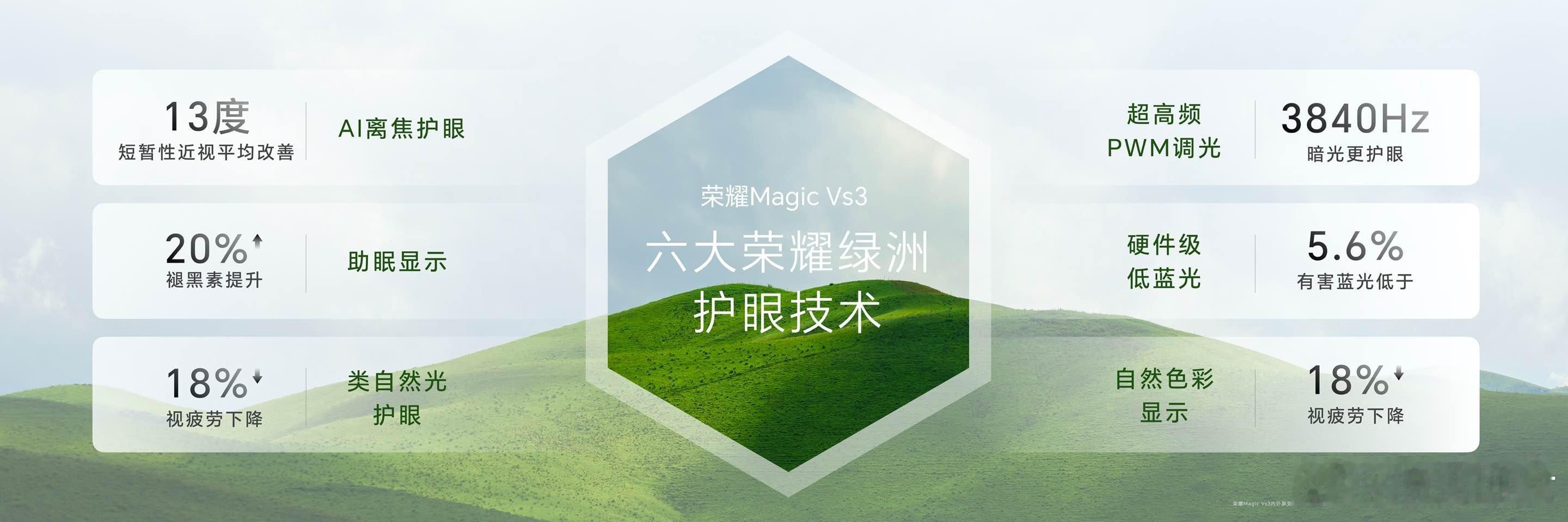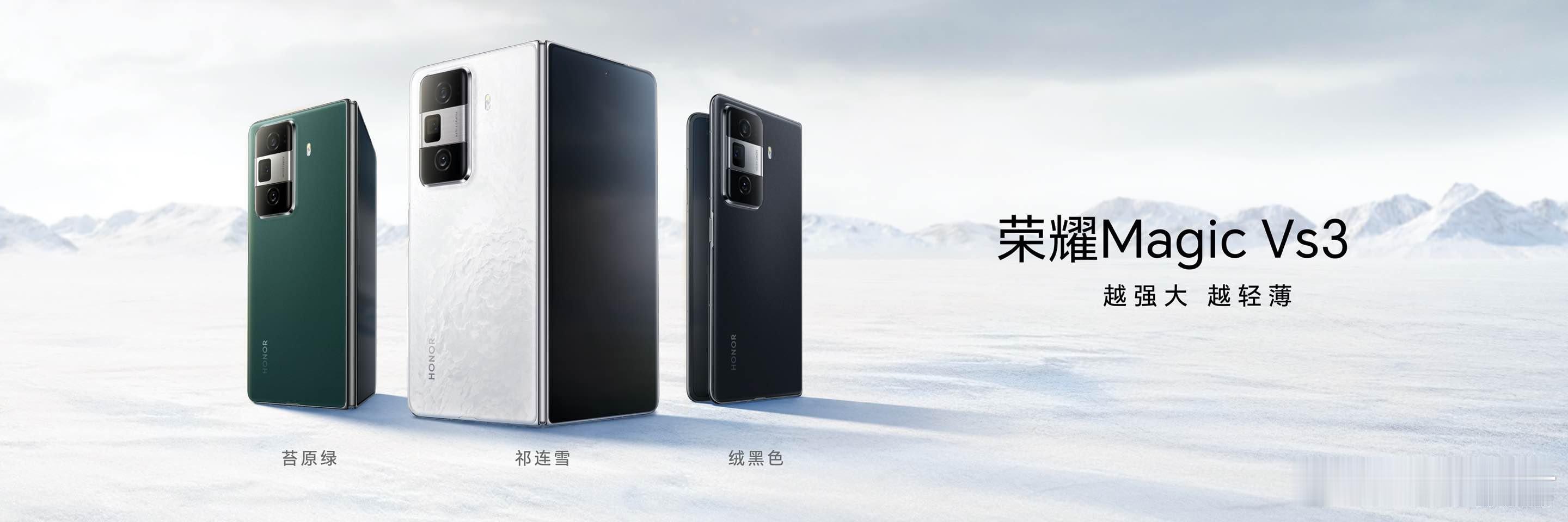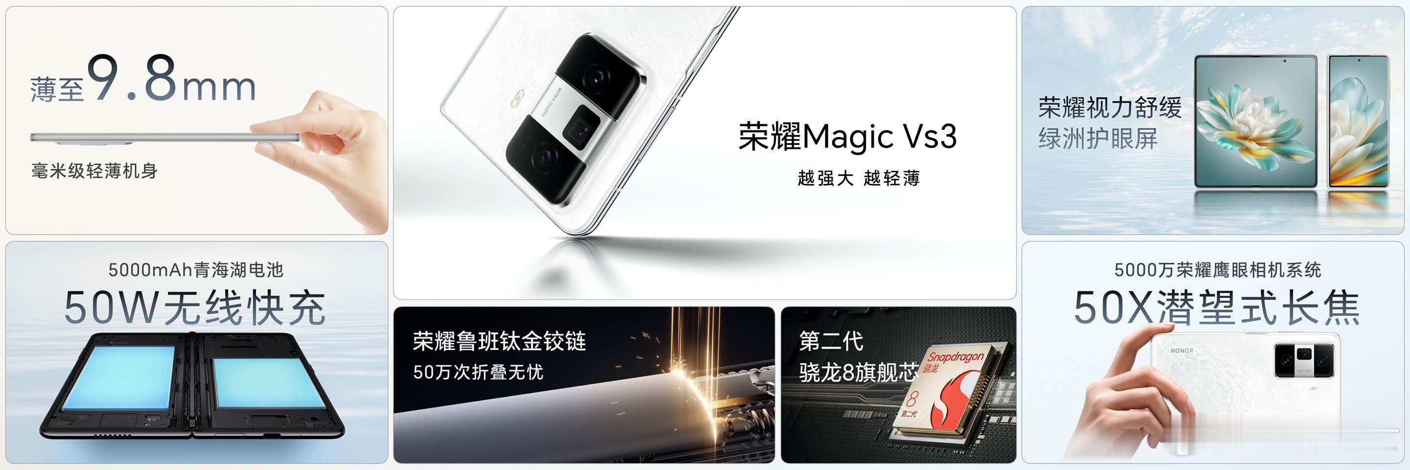 #荣耀Magic Vs3#镜头模组采用极目星环设计,祁连雪、苔原绿、绒黑色三款配色。5000万像素鹰眼相机系统,支持5倍潜望长焦。50W无线快充,5000mAh青海湖电池,闭合9.8mm,重229g,双屏3840Hz PWM调光,双120Hz LTPO刷新率,支持六大绿洲护眼技,同步首发荣耀视力舒缓绿洲护眼屏。