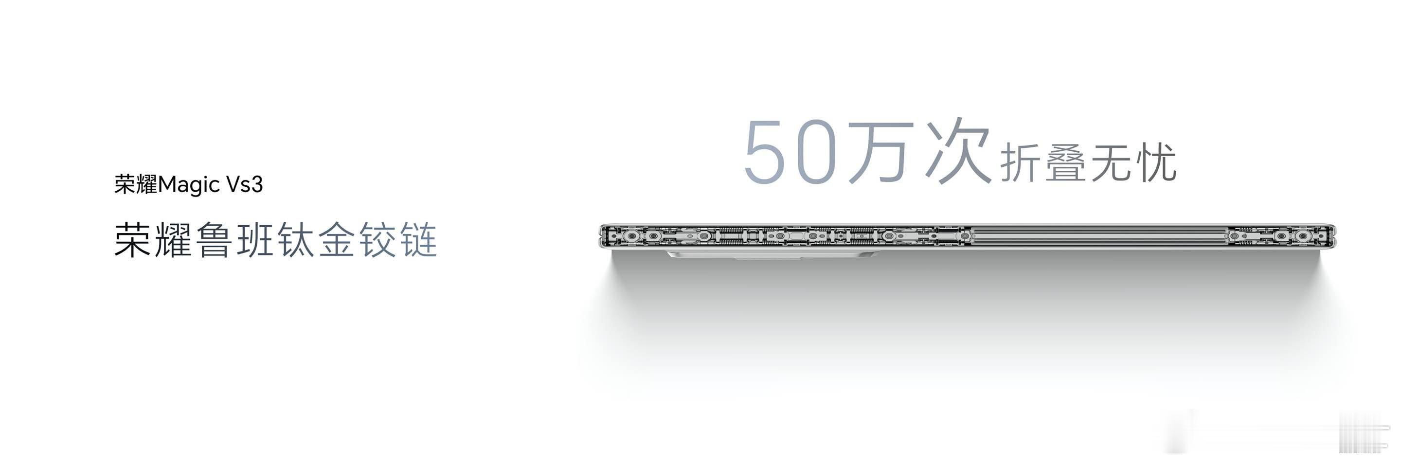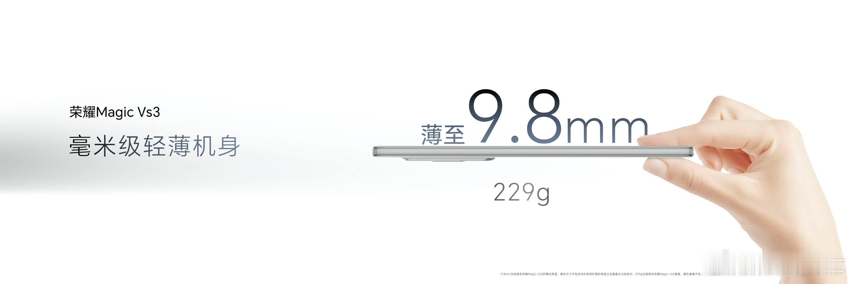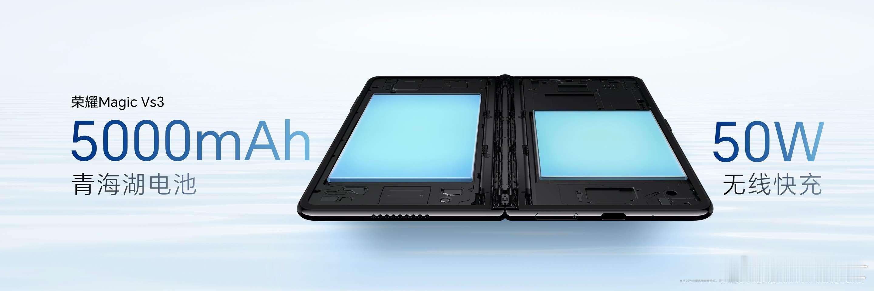 #荣耀Magic Vs3#镜头模组采用极目星环设计,祁连雪、苔原绿、绒黑色三款配色。5000万像素鹰眼相机系统,支持5倍潜望长焦。50W无线快充,5000mAh青海湖电池,闭合9.8mm,重229g,双屏3840Hz PWM调光,双120Hz LTPO刷新率,支持六大绿洲护眼技,同步首发荣耀视力舒缓绿洲护眼屏。