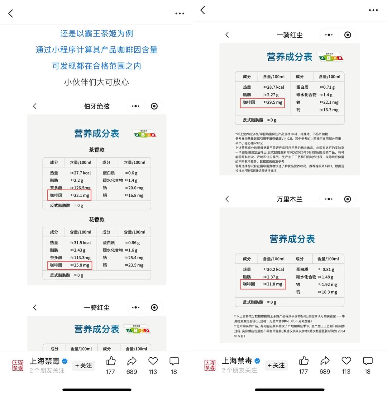 这一权威发声,有效地遏制了谣言的扩散,将讨论拉回科学轨道。经查询,霸王茶姬小程序中每款产品的咖啡因含量测算结果均在合格范围内。