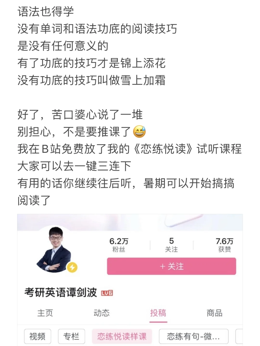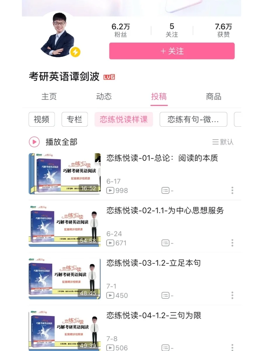 辞别 2 2024-07-14 22:23 波妈阅读讲的真的很好!从如何猜题到如何脚踏实地认真做题,两个方法并用。本来打算再听听其他老师的阅读的,听完波妈的课也感觉没必要再去听其他老师的课了!现在才开始做阅读,今年一战,在职考研,希望英语一能到七十加