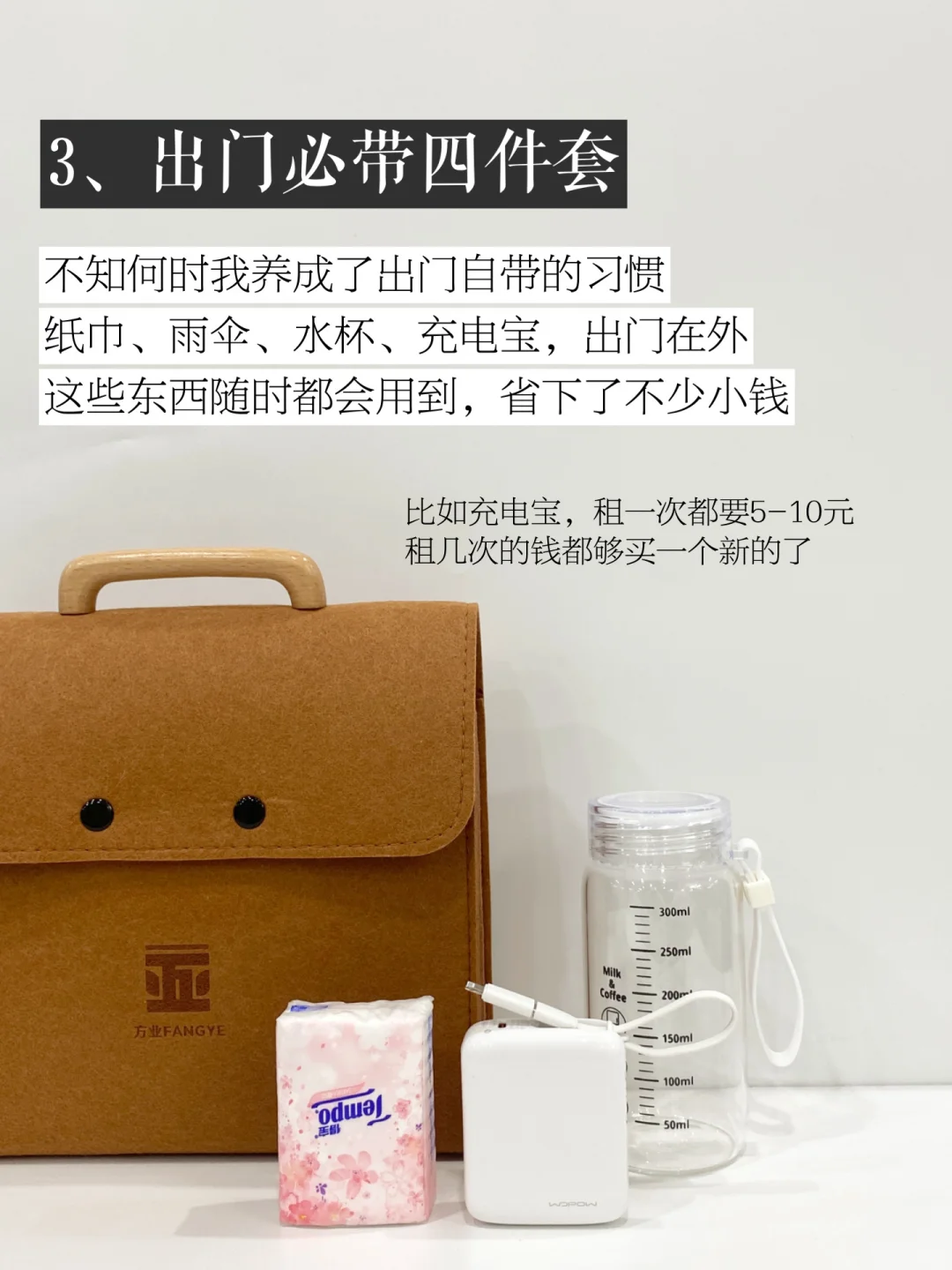 纸巾、雨伞、水杯、充电宝,出门在外这些东西随时都会用到,省下了不少小钱