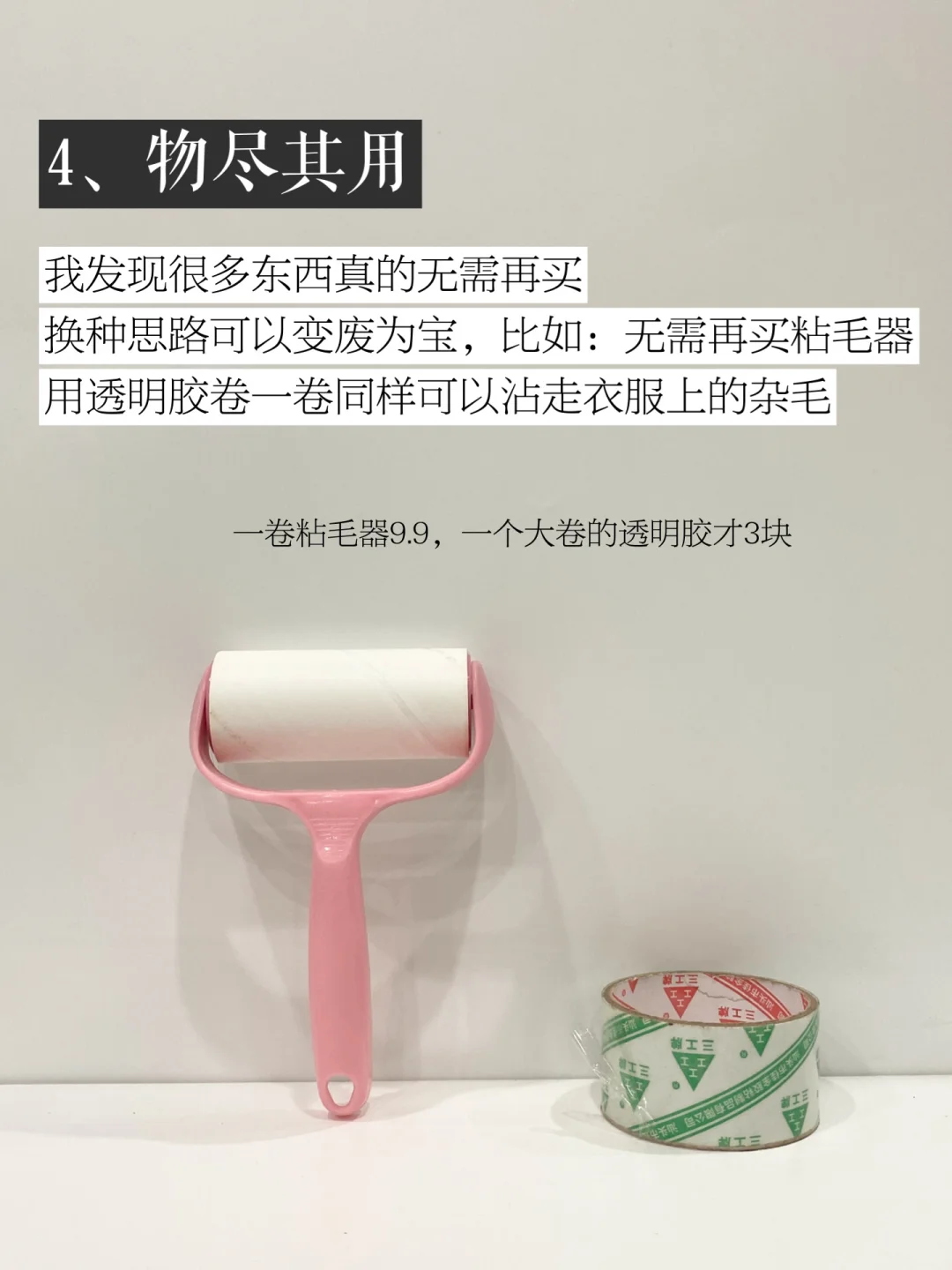 换种思路可以变废为宝,比如:无需再买粘毛器用透明胶卷一卷同样可以沾走衣服上的杂毛