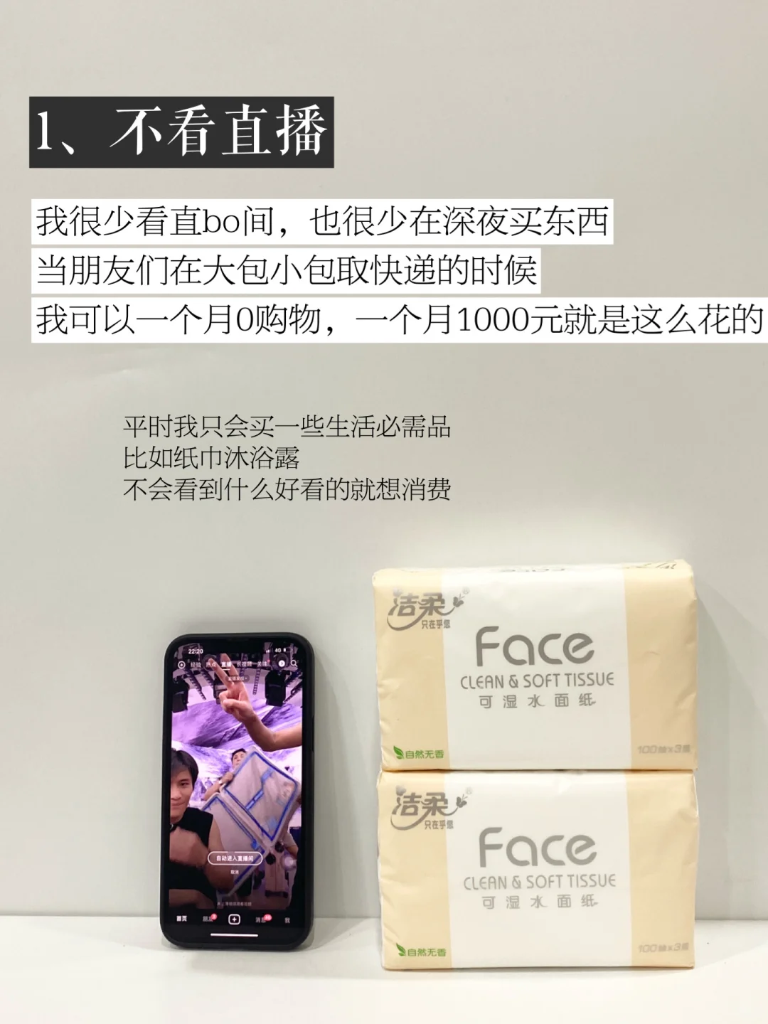 我很少看直bo间,也很少在半夜买东西当朋友们在大包小包取快递的时候,我可以一个月不买东西,一个月1000元就是这么花的