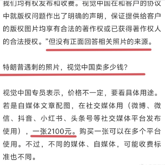 但是“视觉中国”却说照片是它的,网友们如需在社交媒体使用,需支付2100元人民币费用,否则将面临被起诉的风险……