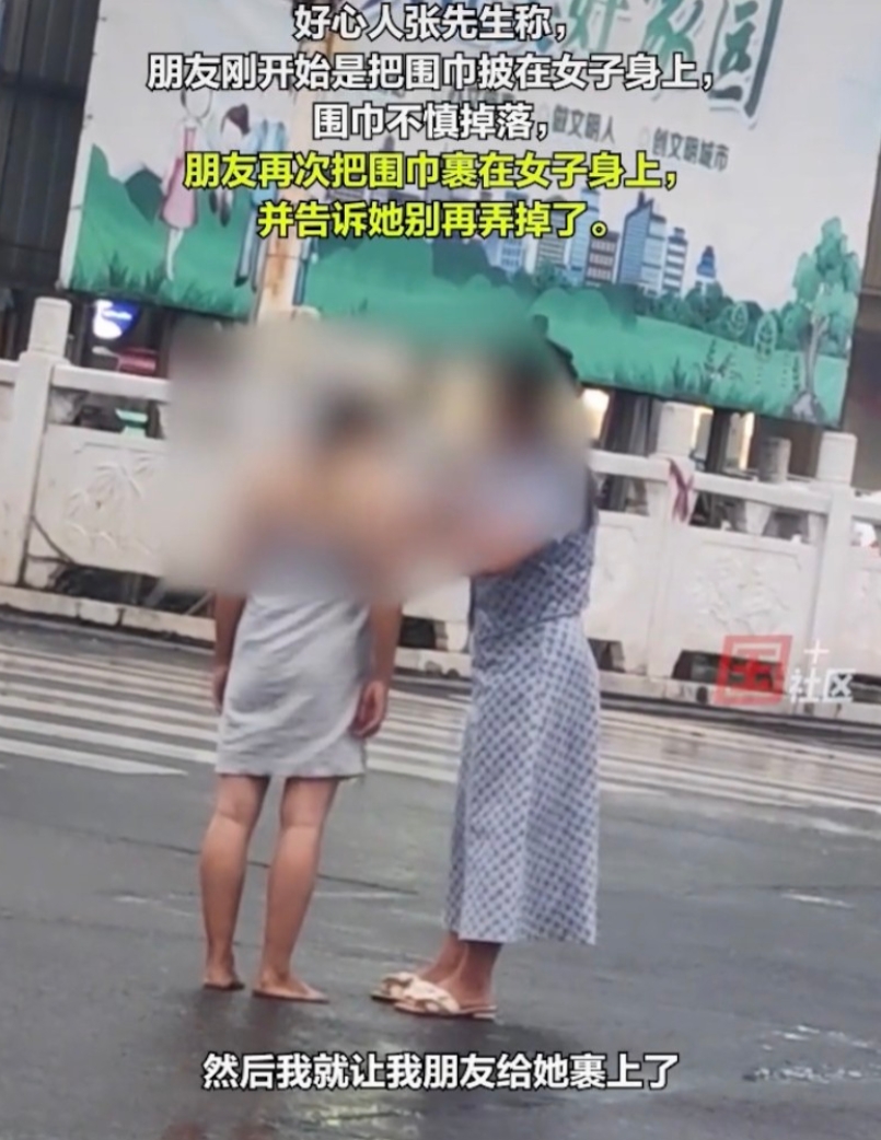 车主张先生这时刚好开车路过,看到这一幕,就觉得于心不忍,想着车上刚好有一条围巾,就让车上的女伴下车帮忙给她裹上,第一次披上时,围巾掉落了下来,见女子无动于衷,朋友又再次把围巾帮忙披上,并对她进行了安慰