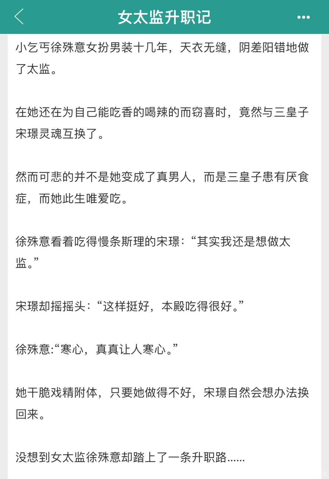 穿越重生 穿越文 古言小说推荐 书荒拯救 穿越小说 古风小说 书荒拯救 好看的小说 言情 言情小说 女扮男装,阴差阳错进宫做了太监。 结果和三皇子互穿了!! 可悲的并不是她变成了真男人,而是三皇子患有厌食症,而她此生唯爱吃。 她看着吃得慢条斯理的某人:“其实我还是想做太监。” 他摇摇头:“这样挺好,本殿吃得很好。” 她:“寒心,真真让人寒心。”