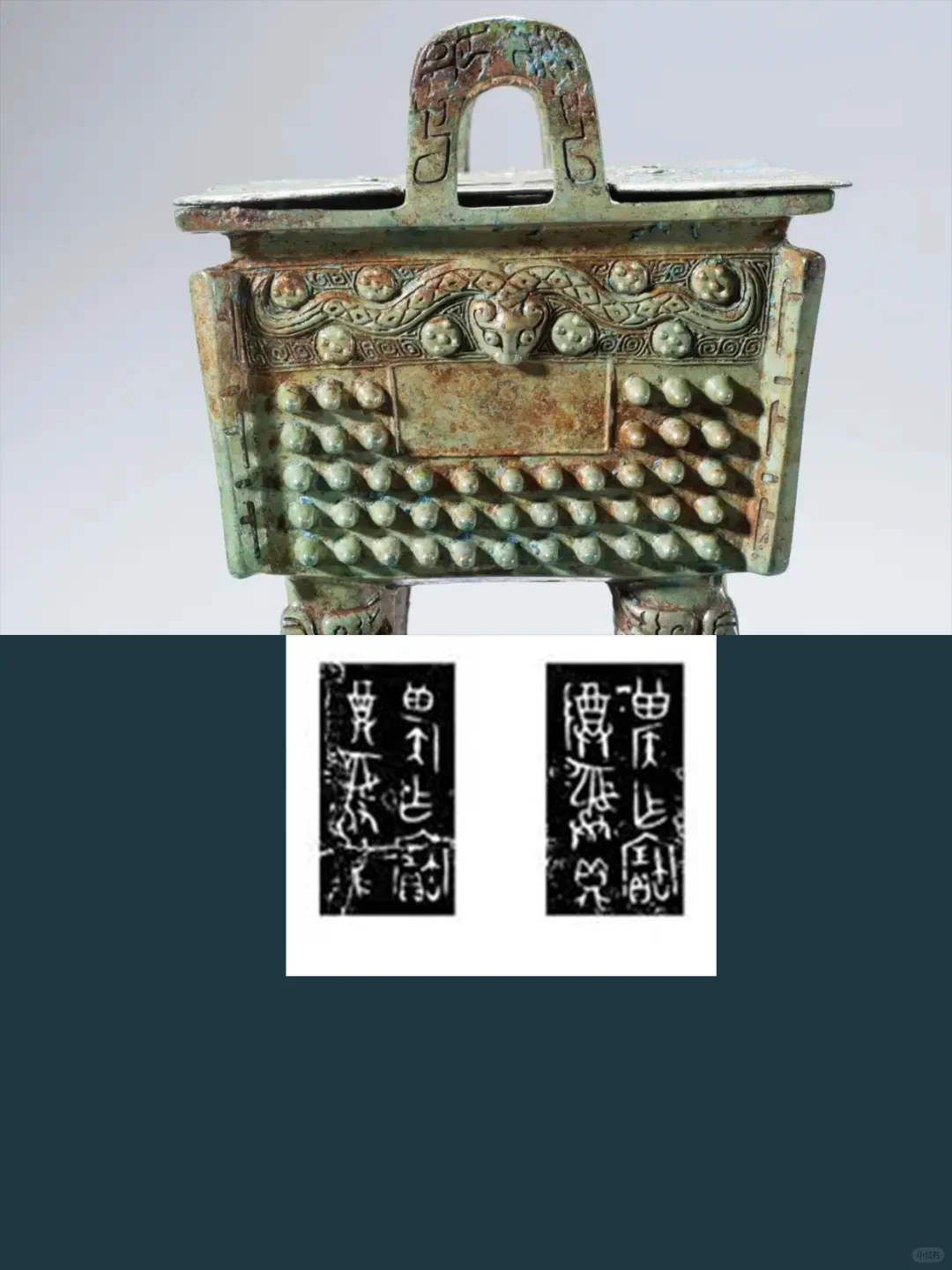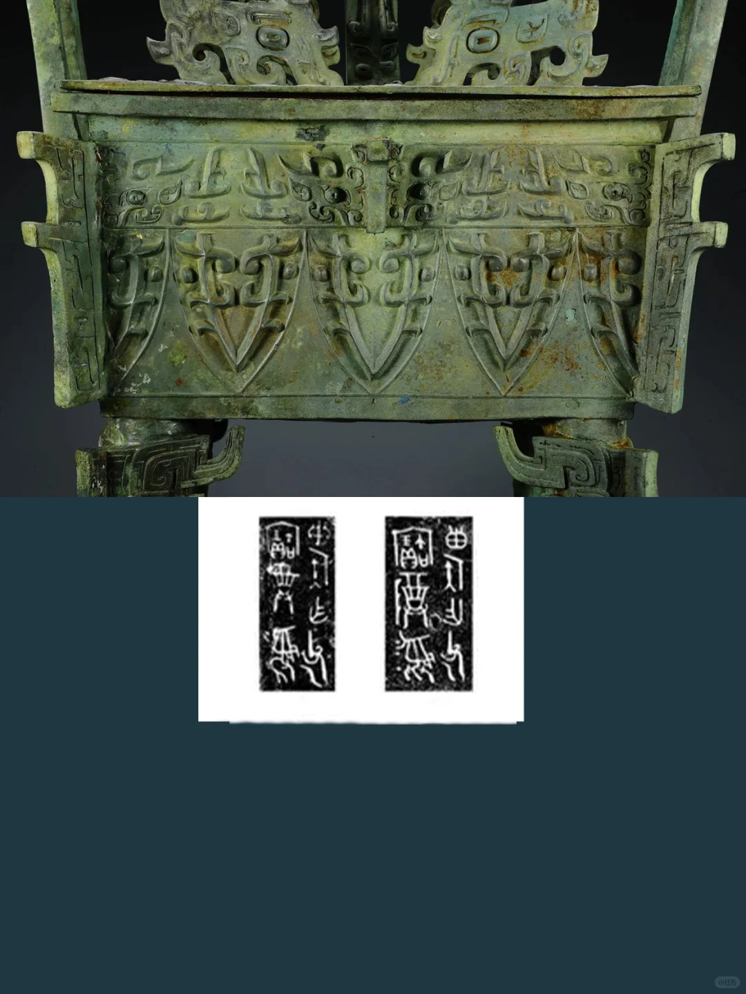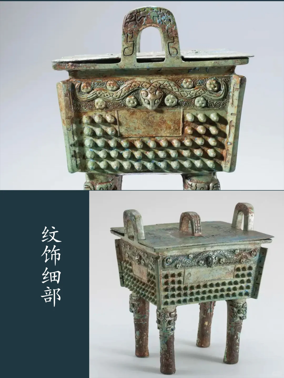 选取一件具体介绍,图二、三,方鼎造型、纹饰介绍。