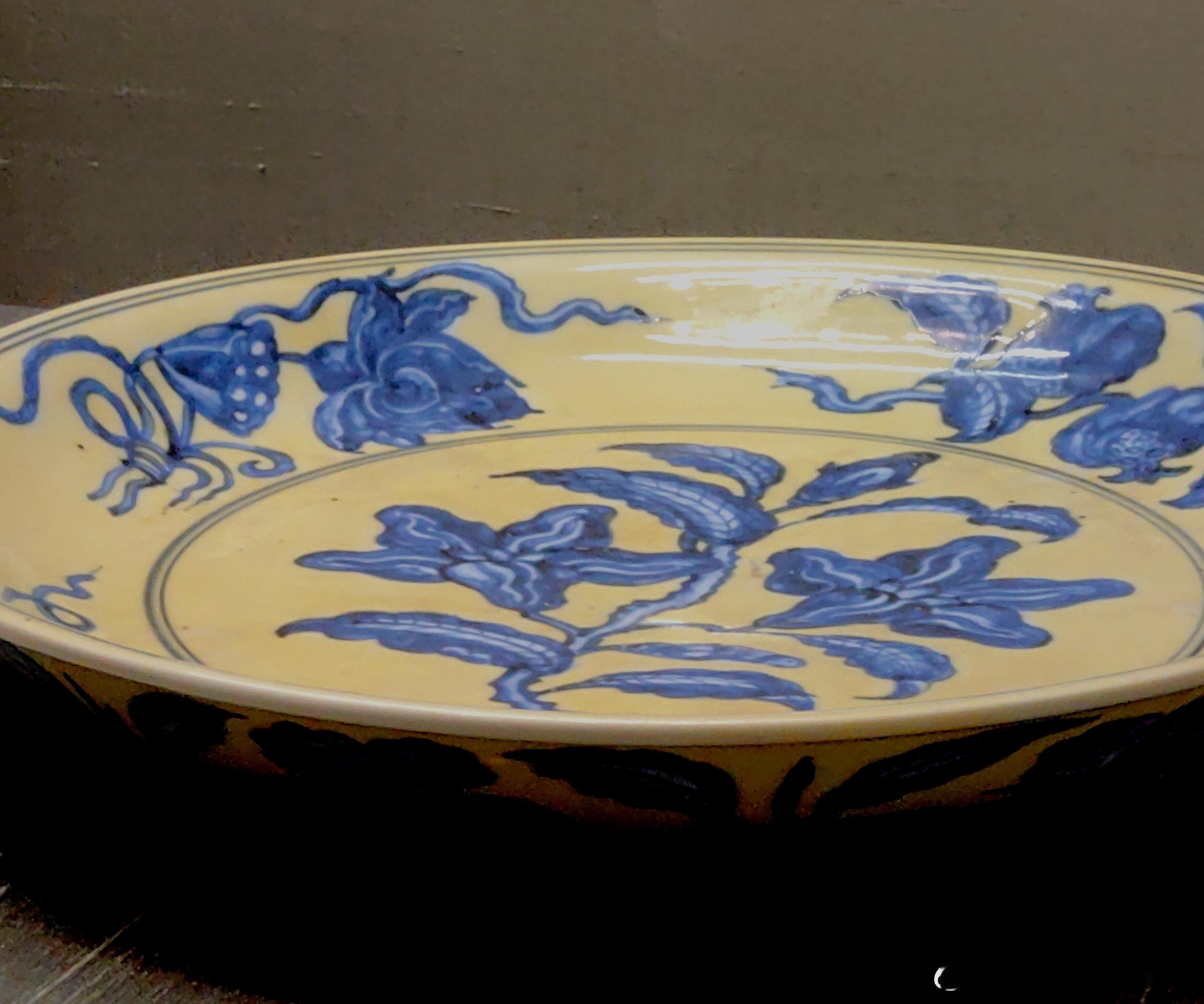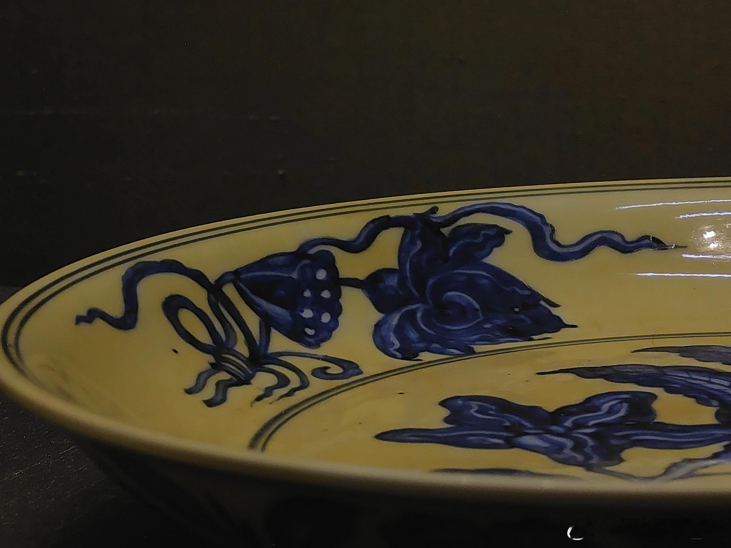 黄地青花折枝花果纹盘明 弘治苏州博物馆藏内外壁以黄釉为地绘青花纹饰。盘心绘折枝栀