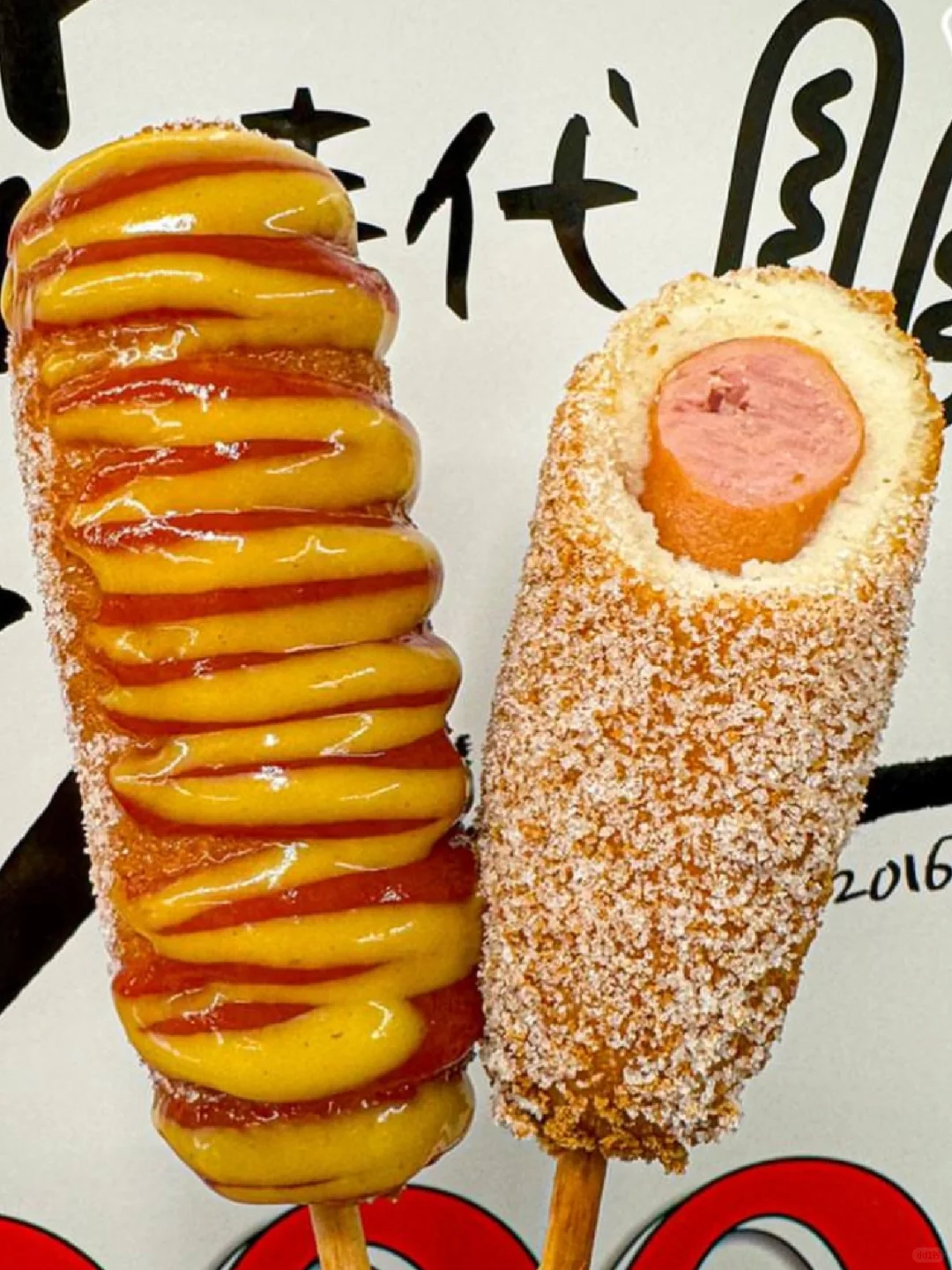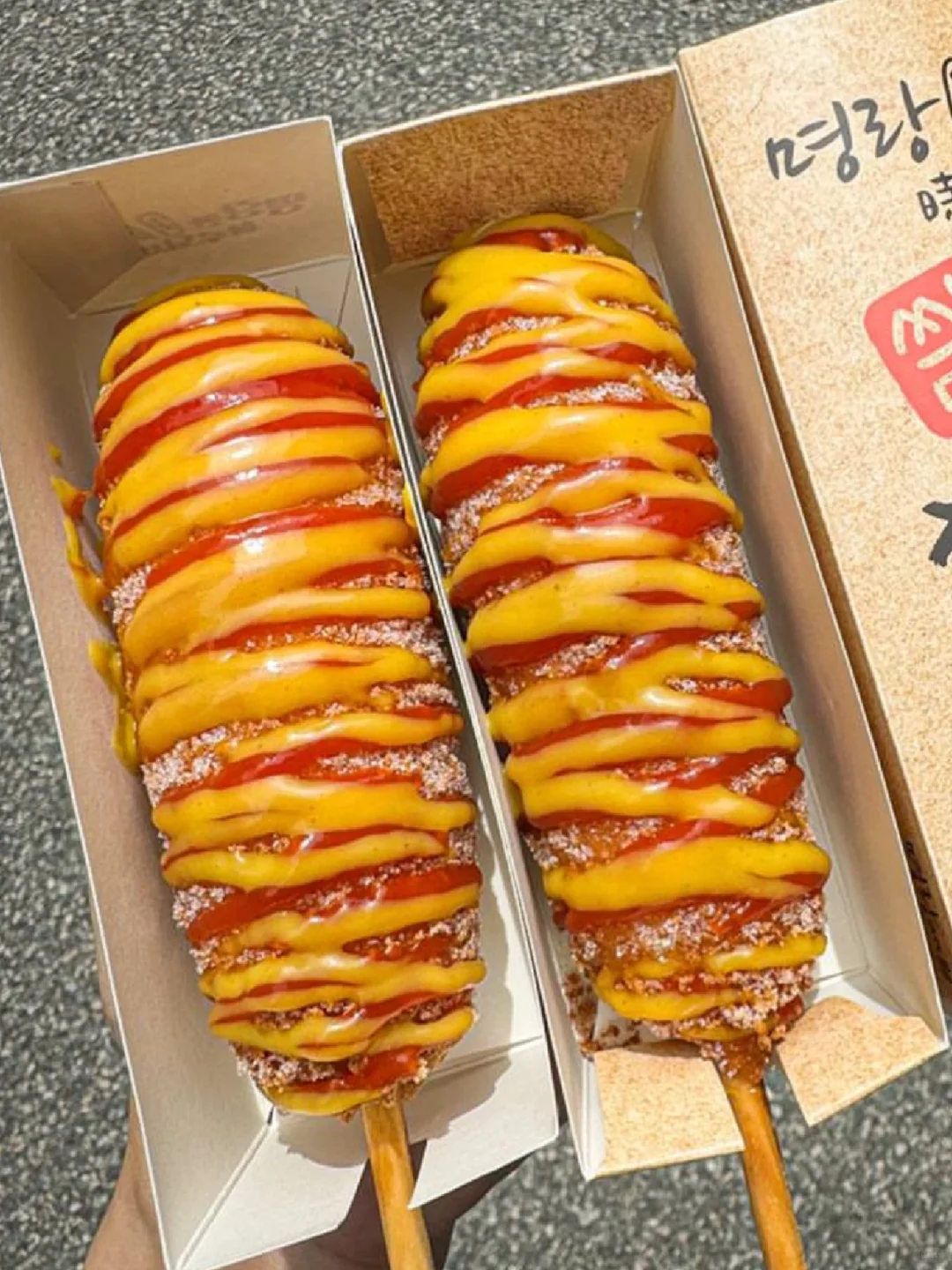 建议人多可以点盒装,一次吃到五种味道 2个人建议买单根就好了! 因为这个很顶饱(有芝士、香肠、土豆、白糖的里面的芝士放凉了都还能拉丝.. 📍明朗热狗,首尔有很多分店