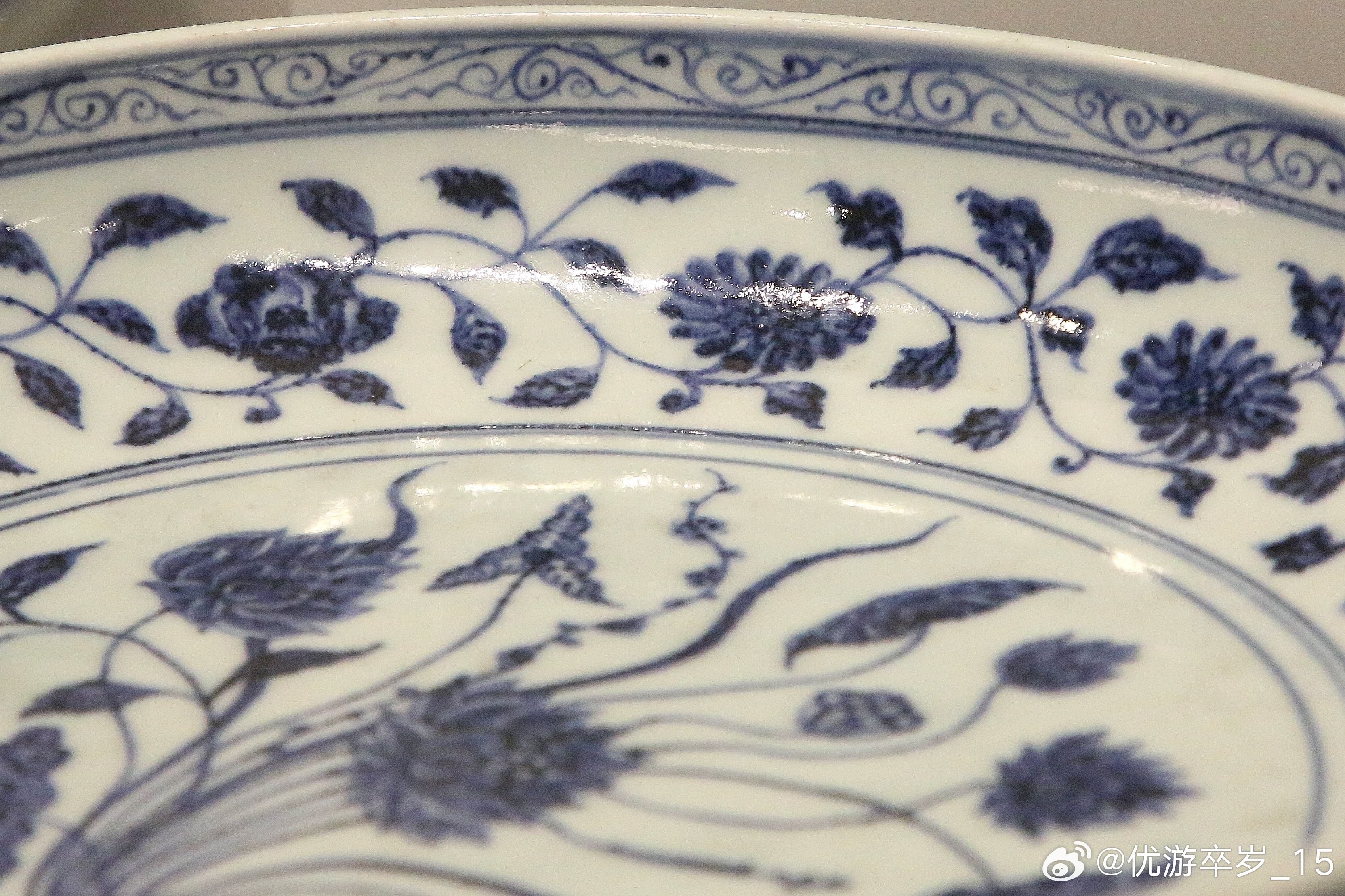 景德镇窑所出。盘心主题纹饰使用青花绘制缎带系扎的一束莲,并配有莲蓬、莲叶等图案。青花采用苏麻离青进口钴料烧制,发色浓艳。莲纹流行于永宣时期,作为青花瓷的固定纹饰,寓意清廉高洁。