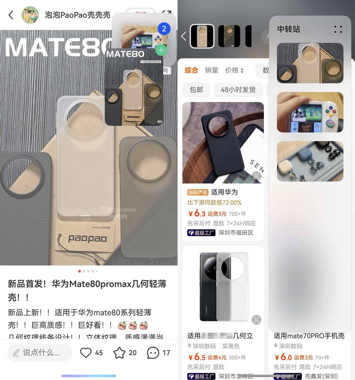 还有一种省事的操作,看到喜欢的商品图,长按拖到屏幕边上的中转站,再拖进阿里巴巴App里,搜索页直接就打开了,这个功能用起来也超级方便。