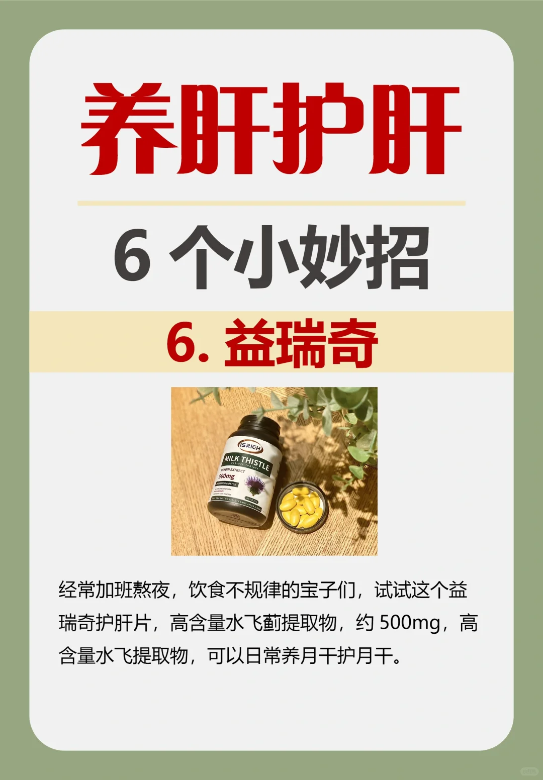 🌙经常熬夜脸色蜡黄没光泽,还特别容易爱发火的宝贝们,这很可能是你的肝脏在警告⚠️ 👍可以试试这几种养肝护肝好方法,坚持一段时间把我们的肝脏养好! 1⃣️养肝疏肝花茶 2⃣️敲胆经 3⃣️多吃绿色食物 4⃣️情绪稳定 5⃣️坚持早睡 6⃣️益瑞奇护肝片