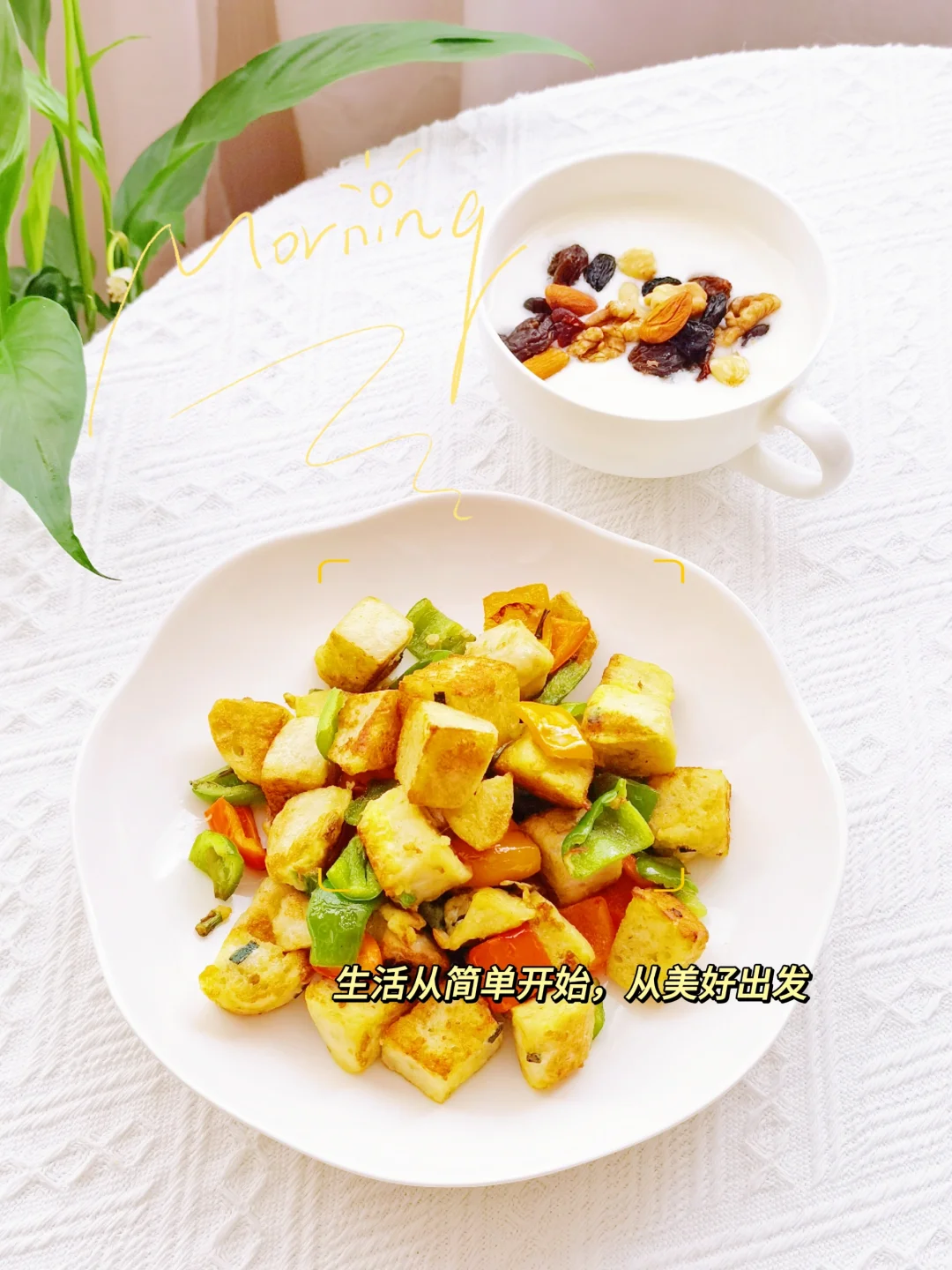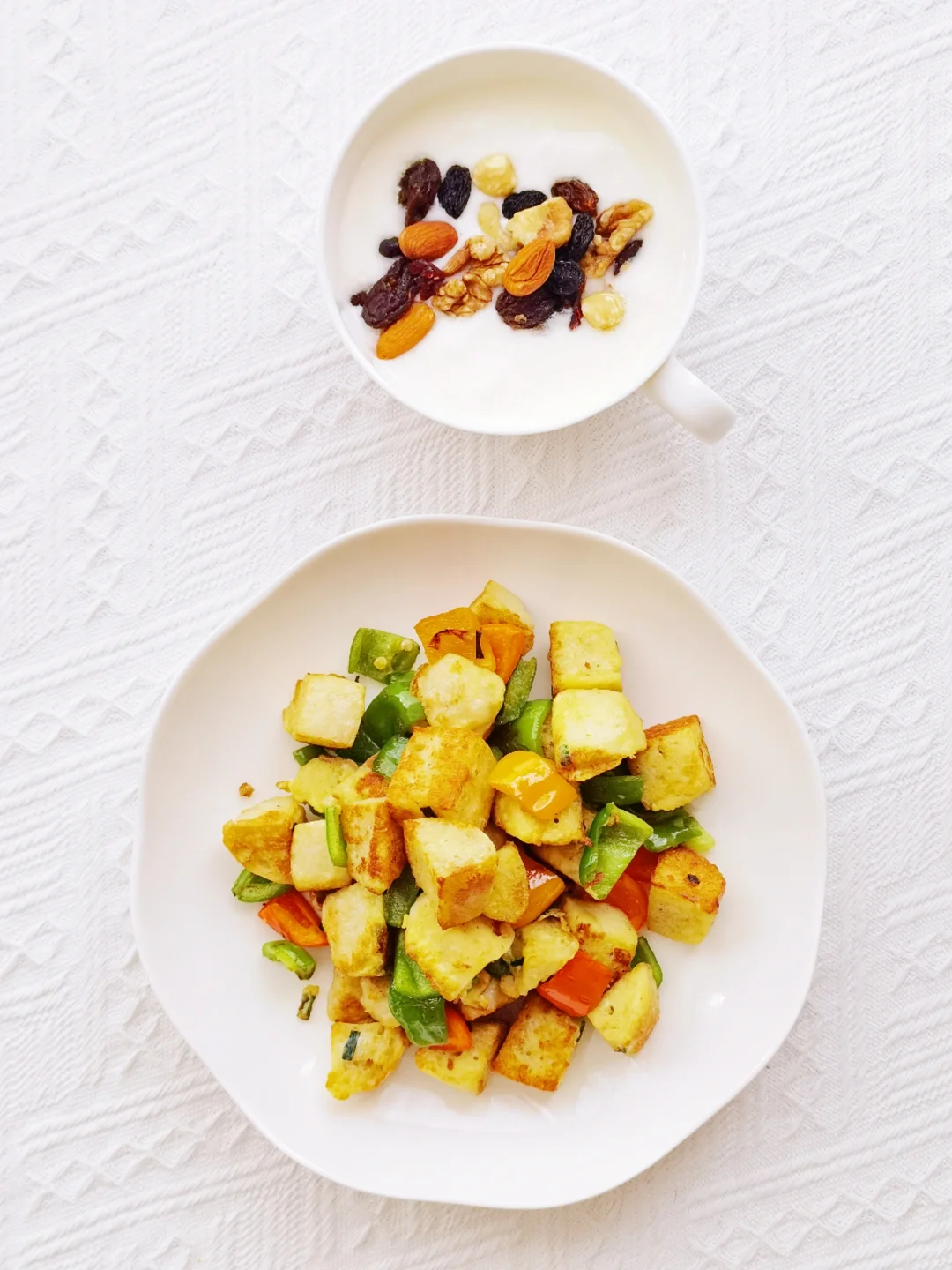 今日早餐:坚果酸奶 彩椒鸡蛋炒馒头 🍱