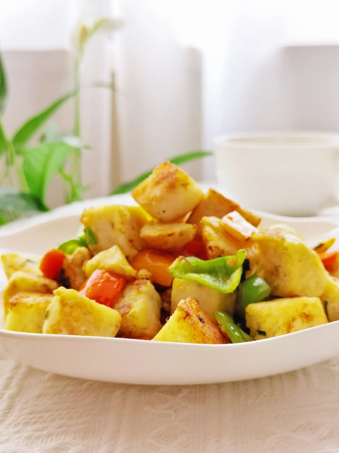 冰箱存货馒头拿出解冻切块裹上蛋液炒真的好香,记得配些出水少的蔬菜,我今天配的红黄绿彩椒,主食蛋白质维生素一盘搞定,简单好吃快去试试吧!
