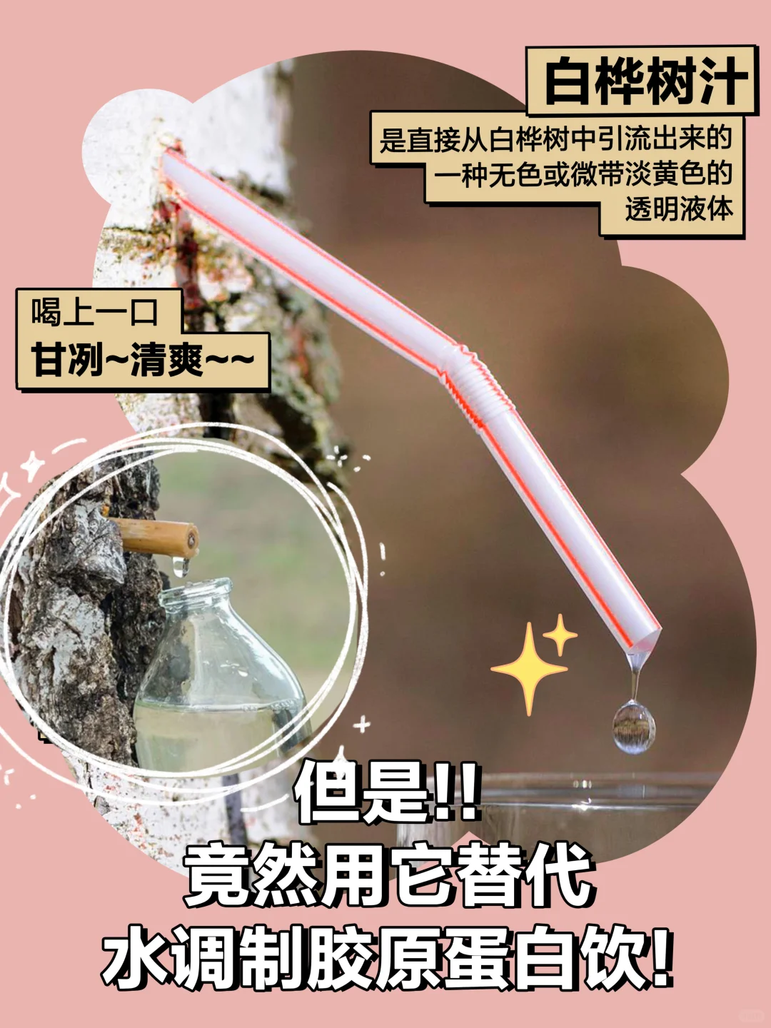 这瓶王炸级胶原蛋白饮 竟然是用桦树汁特调的!!! 东北的小伙伴嘴真严啊 这么宝贝的液体黄金都不告诉大家 酸酸甜甜,很新奇的品尝体验 喝上一口、甘冽、清爽 富含人体所需要的几十种营养物质 用它替代水直接调制胶原蛋白饮 小分子更好吸收,每一口都很纯粹~
