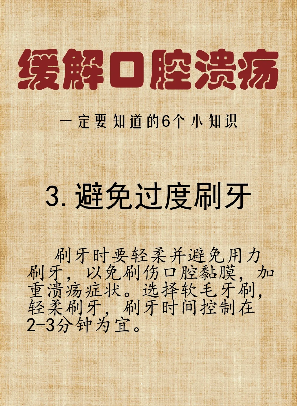 刷牙时要轻柔并避免用力刷牙,以免刷伤口腔黏膜,加重溃疡症状。选择软毛牙刷,轻柔刷牙,刷牙时间控制在2-3分钟为宜。