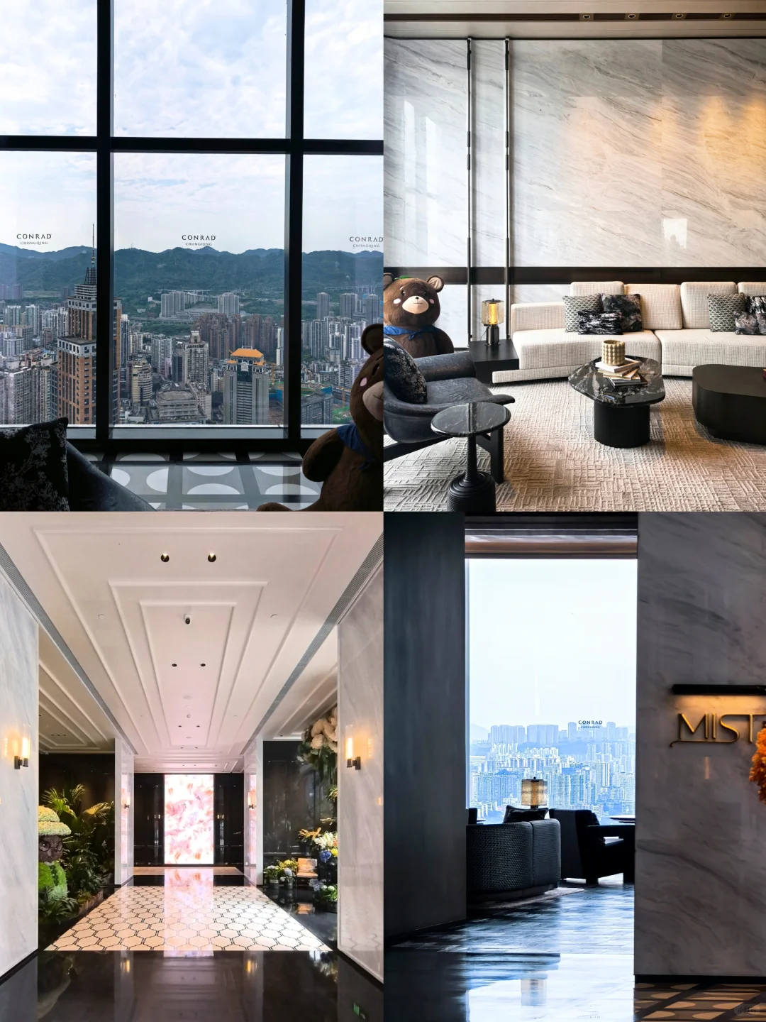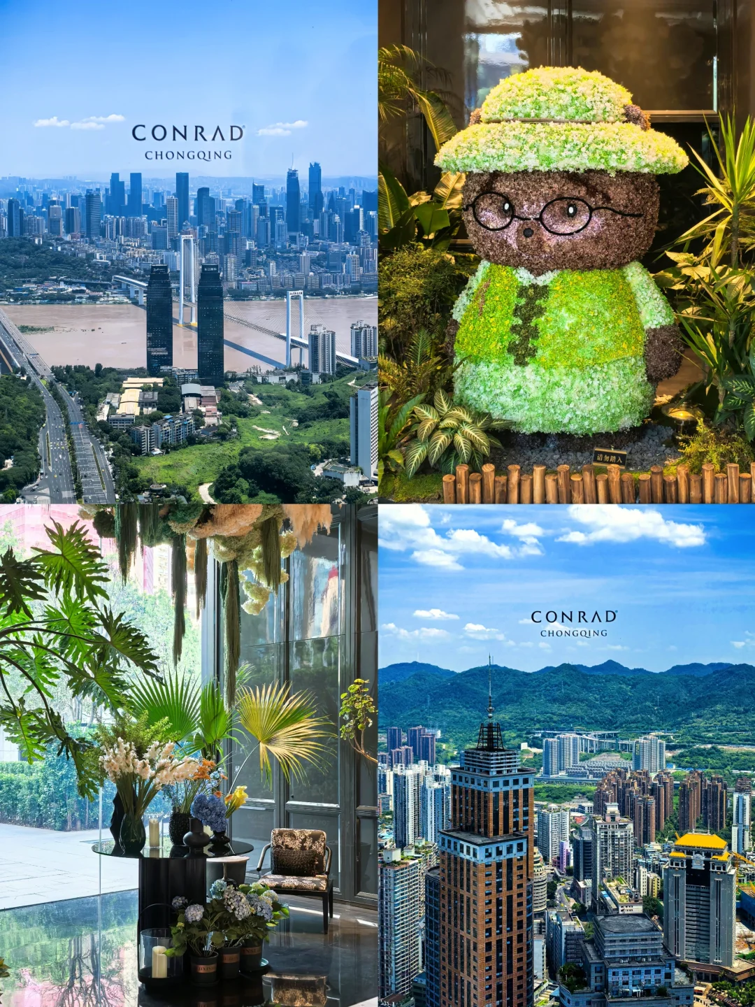 绿色小熊配合绿植和花卉在西式奢华的氛围中增添了一抹清新,非常舒服。空中大堂及公区的落地窗已全部贴上“CONRAD CHONGQING”的标志。