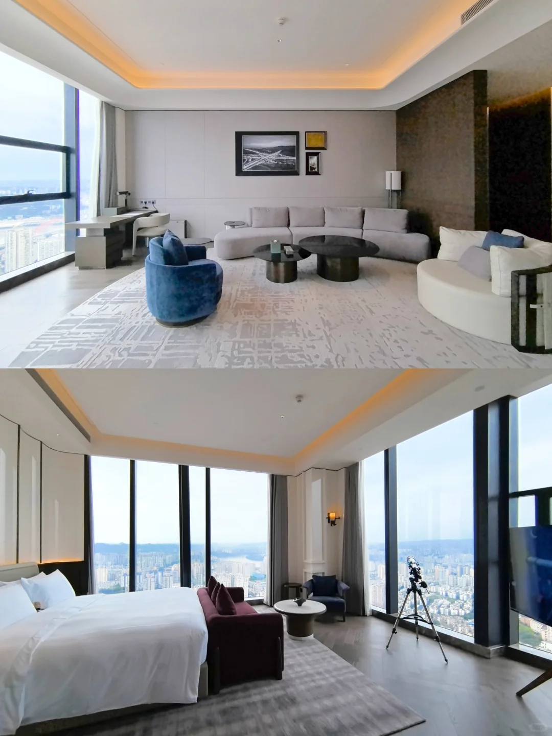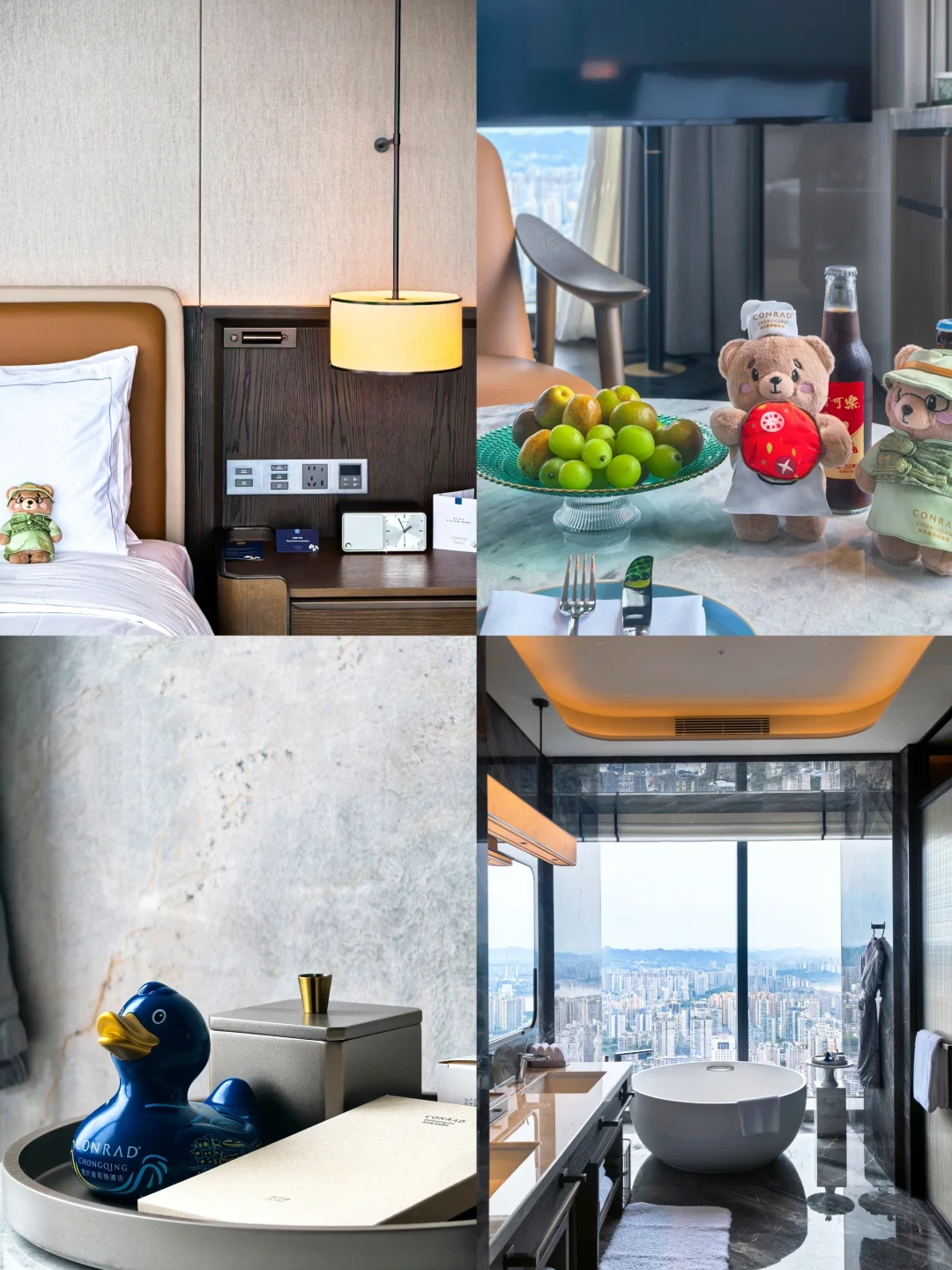 第一晚用希尔顿钻卡预定升级到73平云端270°景观房(图4-5),据说这是最受欢迎的房型,很多现金客人。双台盆盥洗室和圆形的浴缸临窗视野绝佳。卧室两面的巨大玻璃窗观景效果绝佳。欢迎水果是山城特色的脆李配上阳光玫瑰和冬枣。重庆康莱德共有四种小熊,估计收集控要多住几次了。蓝色的康莱德泡澡鸭非常好看。