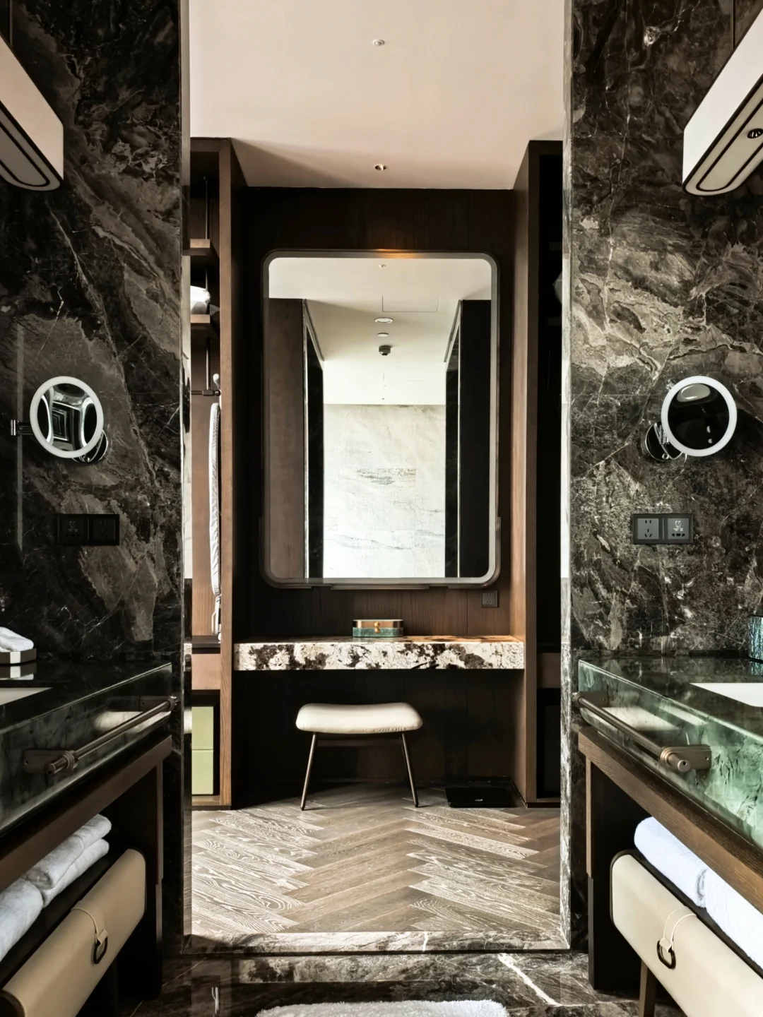 第二晚用100美金套餐同时补差价预定到了当天最后一间120平康莱德套房(图6-7)。这个房型是目前最难定的房间,因为只有3间,不参与升级。房间进门是一个小吧台,背面是备餐间可以直接在房间小型聚餐。客卫连通了玄关和客厅,进到卧室同样是两面落地窗但是配有望远镜,背后是大面积绿色奢石覆盖的梳妆台和分列左右两侧的两个台盆(图18),同样配有圆形浴缸但是浴缸旁边多了一个小电视。