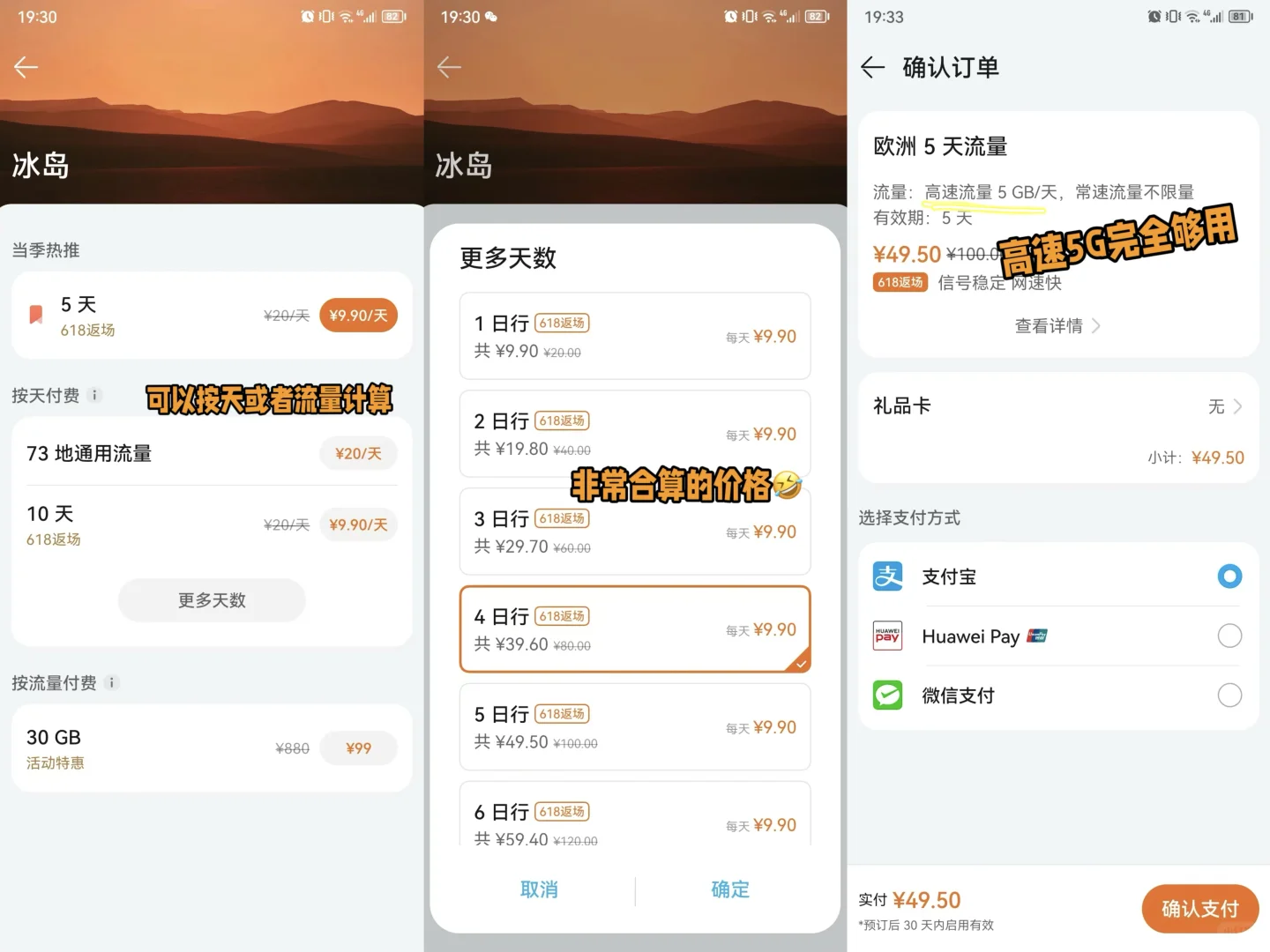 2⃣️ 从国内来的朋友,不用麻烦买当地卡或流量包了,可以直接用华为的「天际通」在app里选好套餐就能上网,能按天也能按流量买,网速很快还稳定,不仅能刷境外app,还可以直接访问国内app,热点共享也不受影响,我的法国卡在冰岛信号很一般,全靠同行朋友一路连接,非常省心;