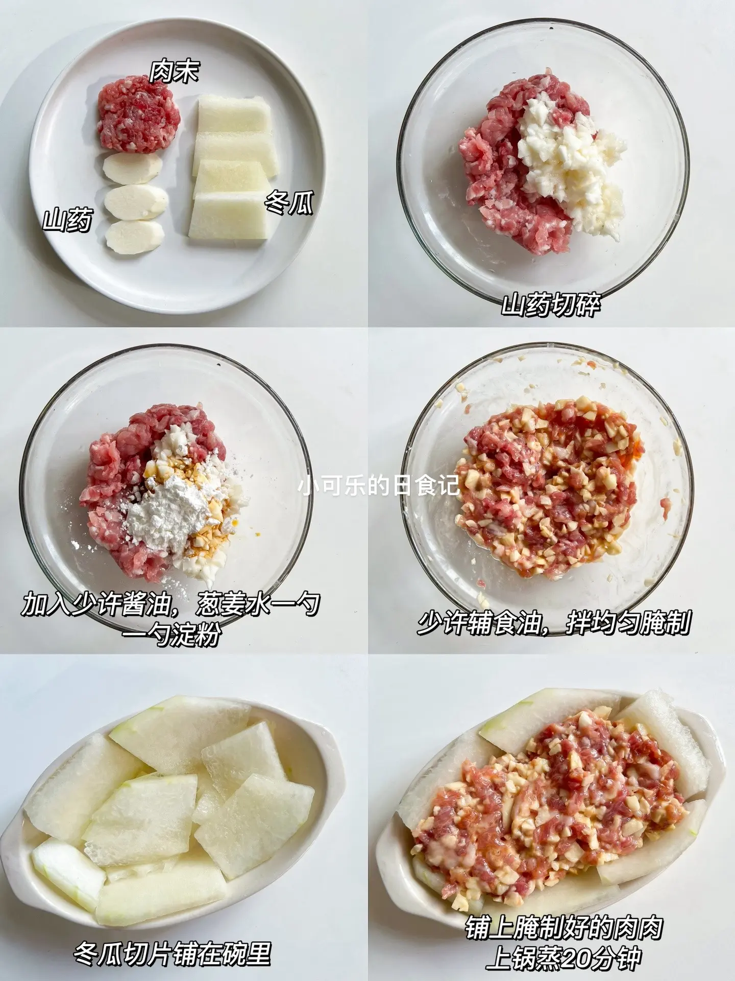 夏天多给宝宝做蒸菜‼️鲜嫩多汁•清爽好吃。天气太热,做蒸菜最方便啦,有肉有菜,做法简单,搭配上冬瓜清清爽爽一点不腻哦,山药健脾养胃,而且蒸菜简单不上火,蒸一蒸就能轻松搞定,营养好吃又开胃。 - 🥣食材: 冬瓜 猪肉末 山药 ✅详细做法请看图片 ✅山药过敏的宝宝可以换成莲藕 ✅1岁以下宝宝不放酱油,用香菇粉/虾皮粉替代