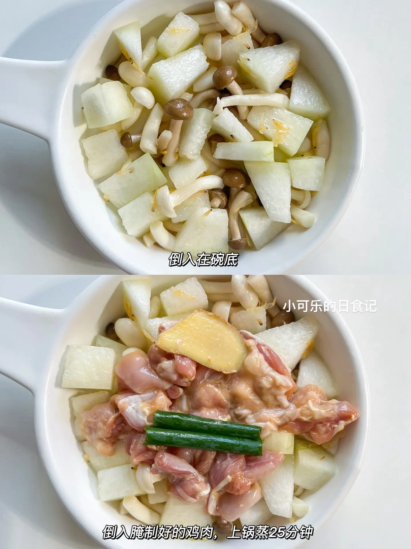 夏天多给宝宝做蒸菜‼️鲜嫩多汁•营养好吃。天气太热,做蒸菜最方便啦,有肉有菜,做法简单,这么做的鸡腿软嫩不柴,搭配上冬瓜清清爽爽一点不腻,不爱吃肉的宝宝也要试试,蒸菜简单不上火,拌饭也是绝绝子 🥣食材: 鸡腿 海鲜菇 蟹味菇 冬瓜 葱、姜 ✅详细做法请看图片 ✅食材大小根据宝宝的接受能力处理