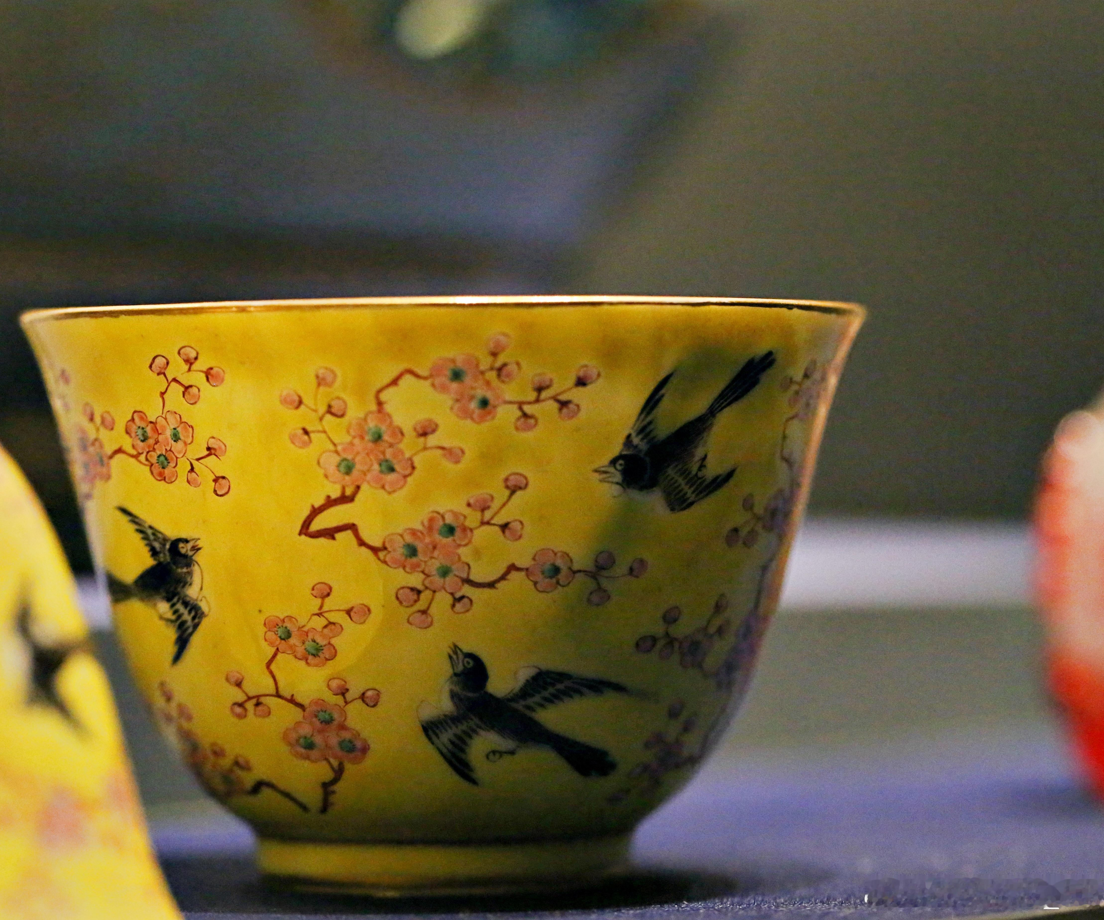 景德镇窑黄地粉彩梅雀纹碗清·同治(1862-1874)首都博物馆藏朝阳区高原街出