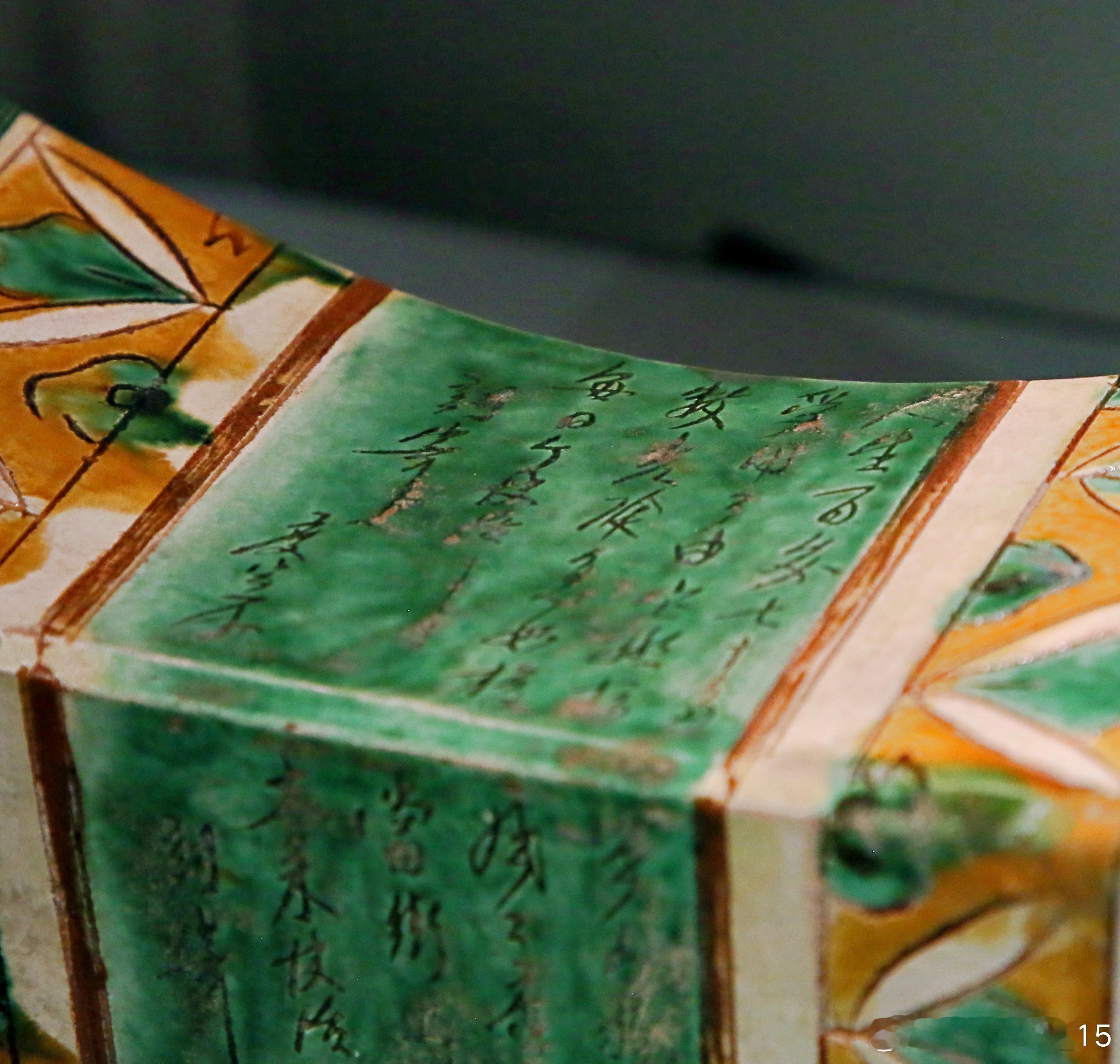 此枕泥质红陶,施化妆土。长方形,束腰,以黄、绿、白三彩装饰,每面中心部位都有行书题诗一首。两侧为边饰,绘花卉图案,中间部位有对称双孔。在瓷器上题写通俗诗句和民谚作装饰是磁州窑的一大特点。