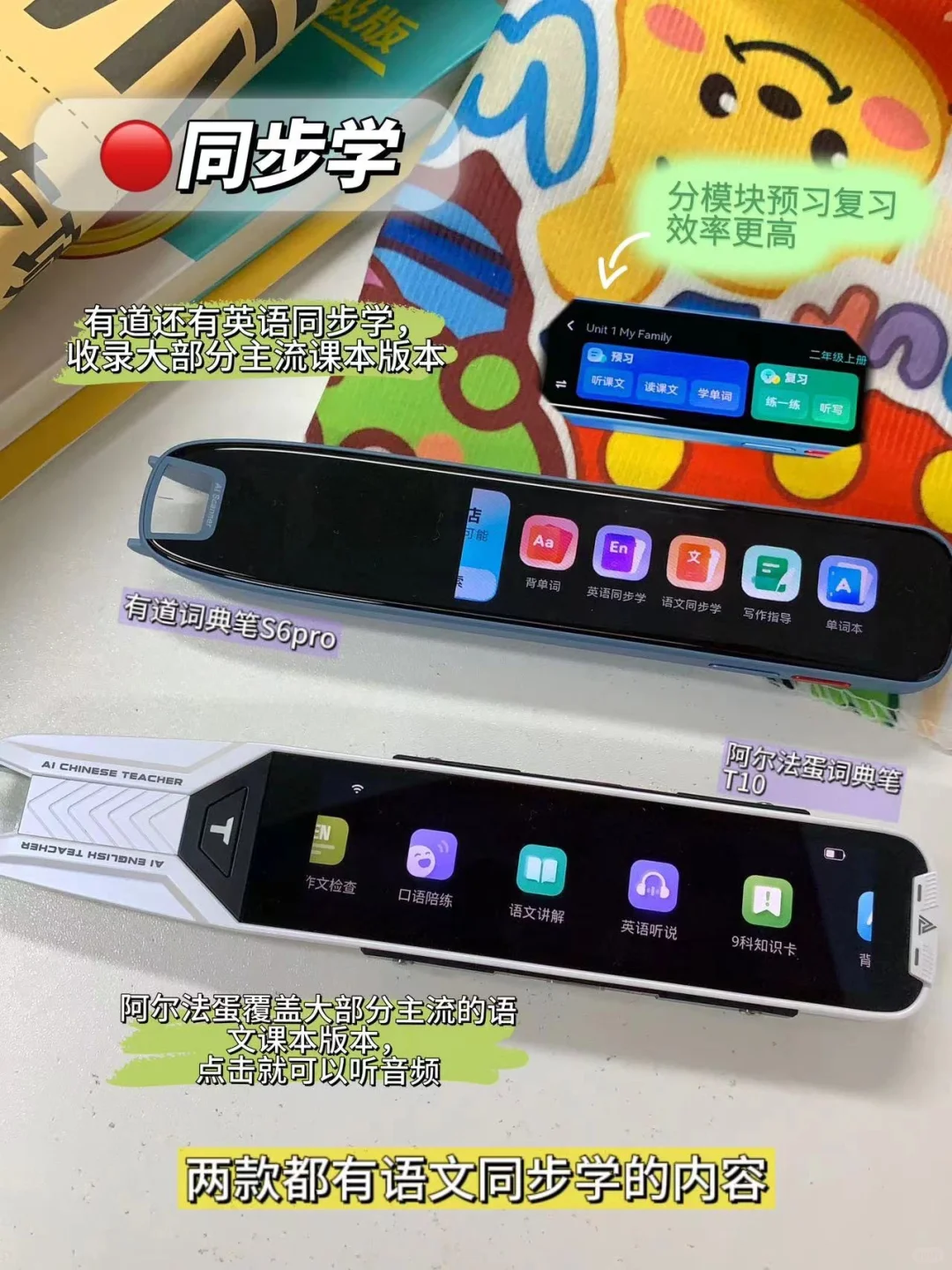 有道和阿尔法蛋都有语文同步学的内容。有道词典笔S6pro还有英语同步学的内容,收录了大部分主流的课本版本,分类分区预习和复习,规划清晰,节省时间。阿尔法蛋的覆盖了大部分主流的语文课本版本,孩子可以点击听取⾳频内容。