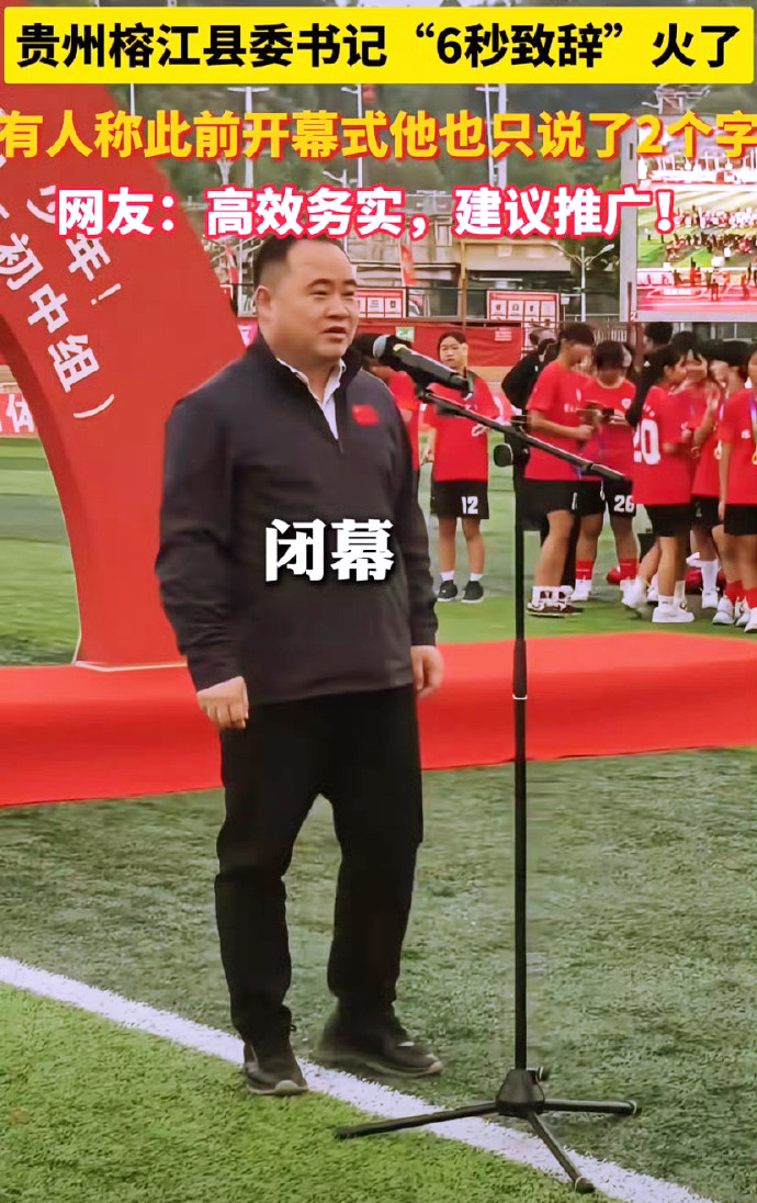 在贵州黔东南州“州长杯”榕江赛区闭幕式上,榕江县委书记徐勃疾步走上球场,拿起话筒只说了“闭幕”二字就结束了他的致辞,现场群众先是一愣,随即爆发出热烈的掌声与笑声,紧接着相关视频流入网络,更是引发如潮好评。
