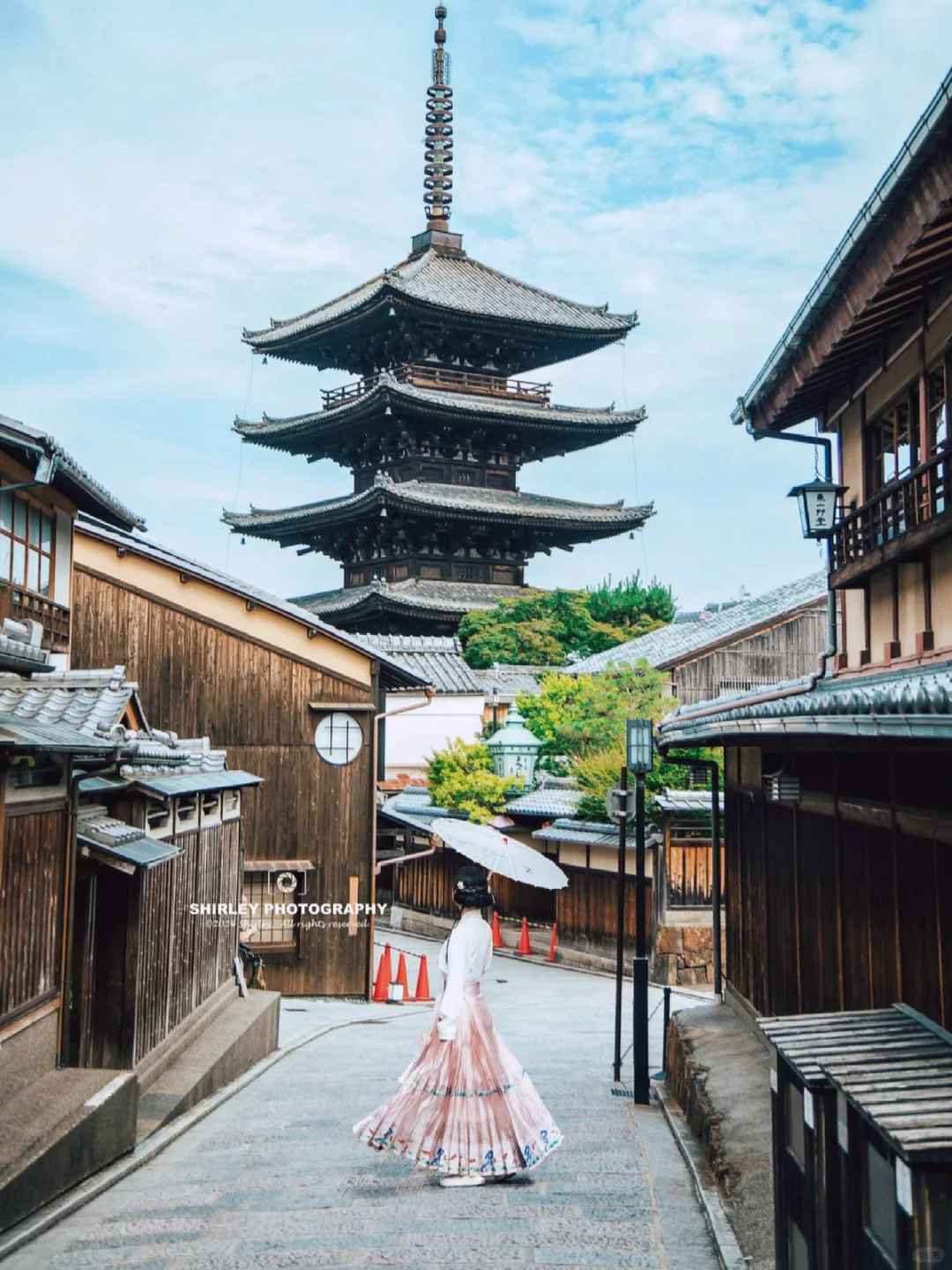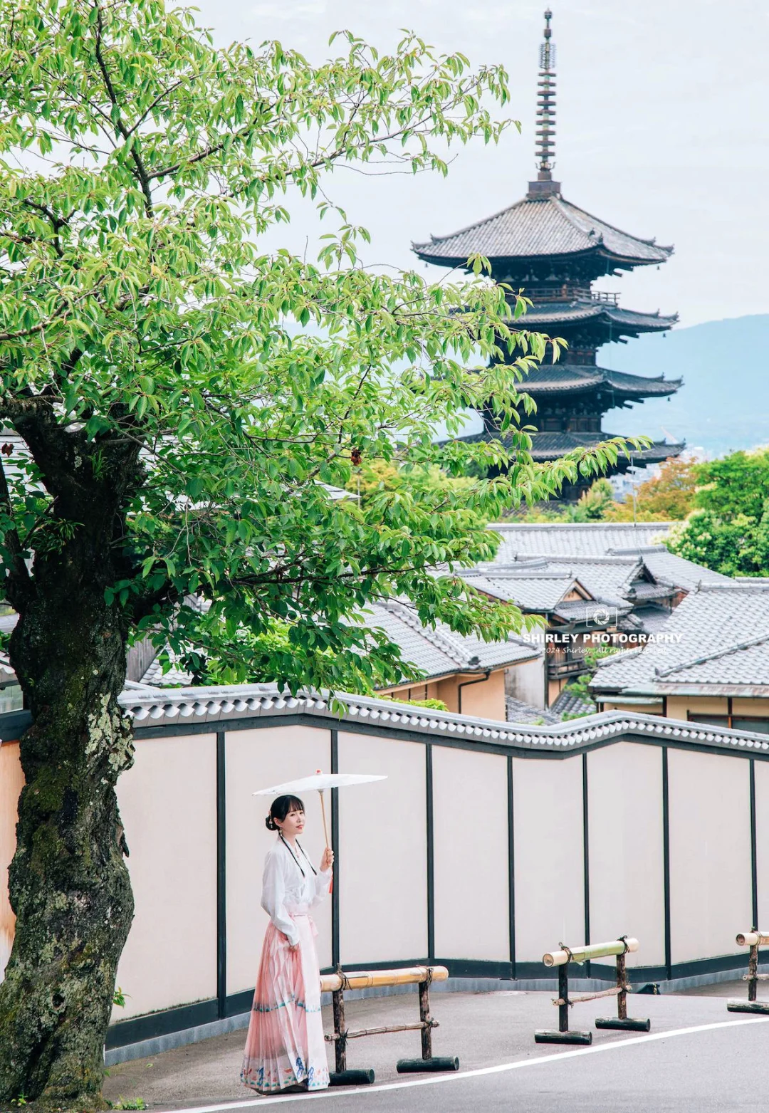 6️⃣高台寺停车场的马路对面:是当地摄影师喜欢的旅拍角度,没什么游客。人站在日式围墙前,背后是八坂塔(P10)