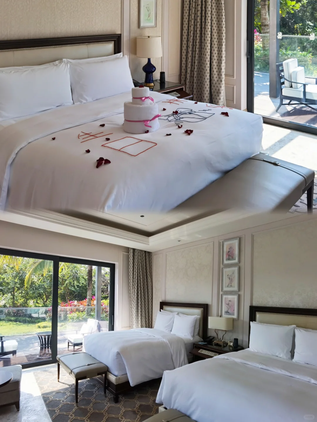 海口丽思卡尔顿的别墅不参与会员升级,虽然有万豪白金卡但是在丽思卡尔顿没有任何用处,只能现金定别墅。这家丽思卡尔顿的别墅起步就是双卧,分别是一个大床和一个双床,连接两个卧室的中间是客厅加餐厅一起外面有一个无边框泳池直通户外的花园。大号泳圈这些都是免费提供。