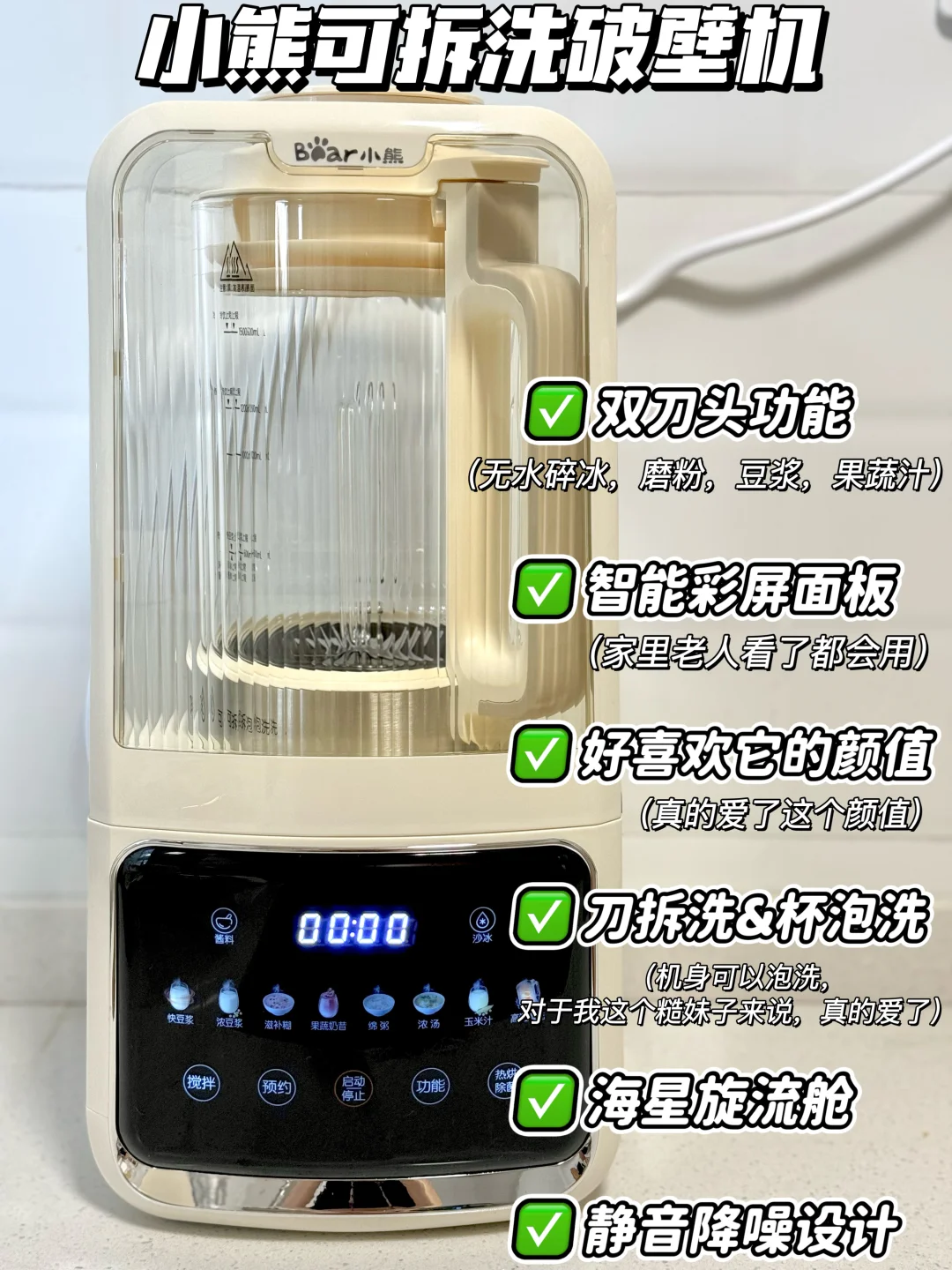🍉小熊可拆洗破壁机🍉,不仅颜值高,噪音小!还搭配两种刀头,即能满足我做豆浆米糊的需要,换个研磨碎冰刀头还能自己在家研磨五谷粉,真的太爱了,日常还能榨蔬果汁,而且能做绵绵冰。刀头拆洗真的很方便,一拔,一拿,一冲就很干净了,杯身还可以直接放水里洗!这款破壁机打出的豆浆比之前的更细腻丝滑,豆类不需要泡,直接打!最喜欢它的智能触控彩屏,清晰明了,操作简单真的爱了!