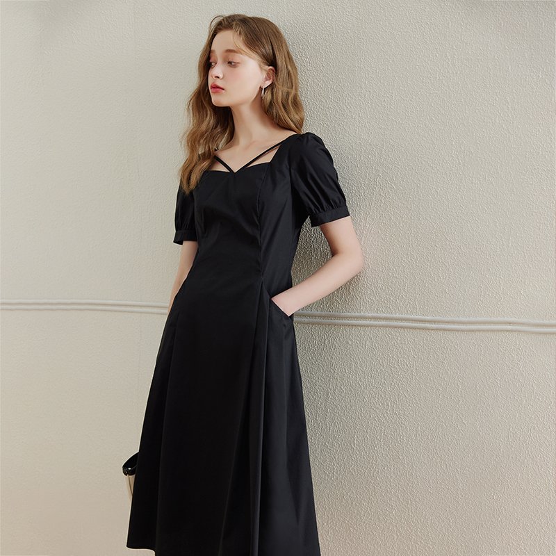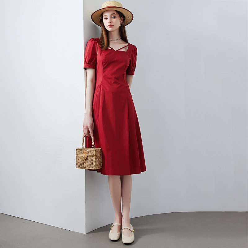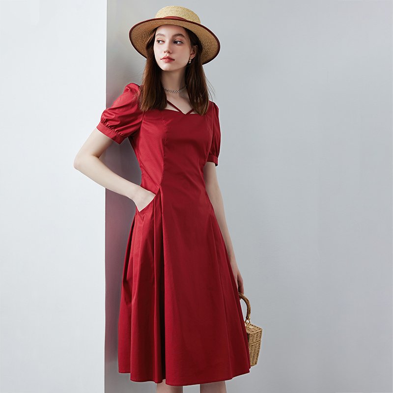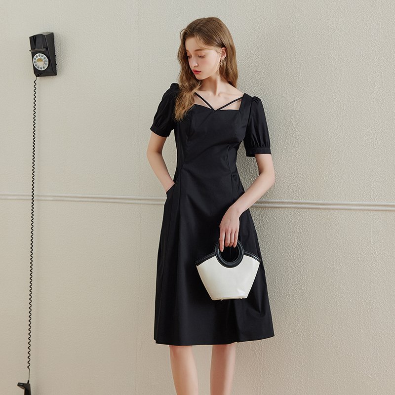 纯色设计感气质方领连衣裙-简约的纯色连衣裙 多种颜色供你选择 高级黑与气质红 都具有它的美丽 细节里的小巧思 方领和交叉带设计 修饰你的领口 显露你的锁骨 透露别样风情