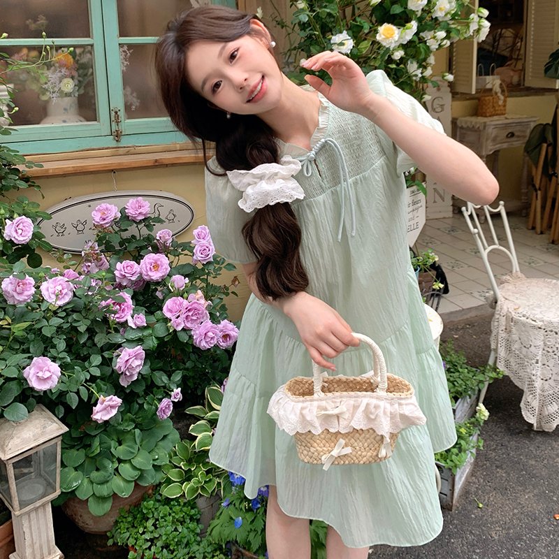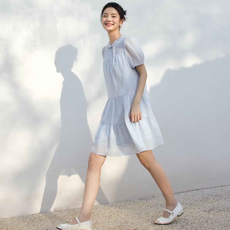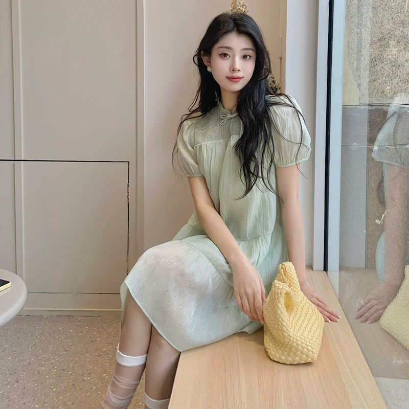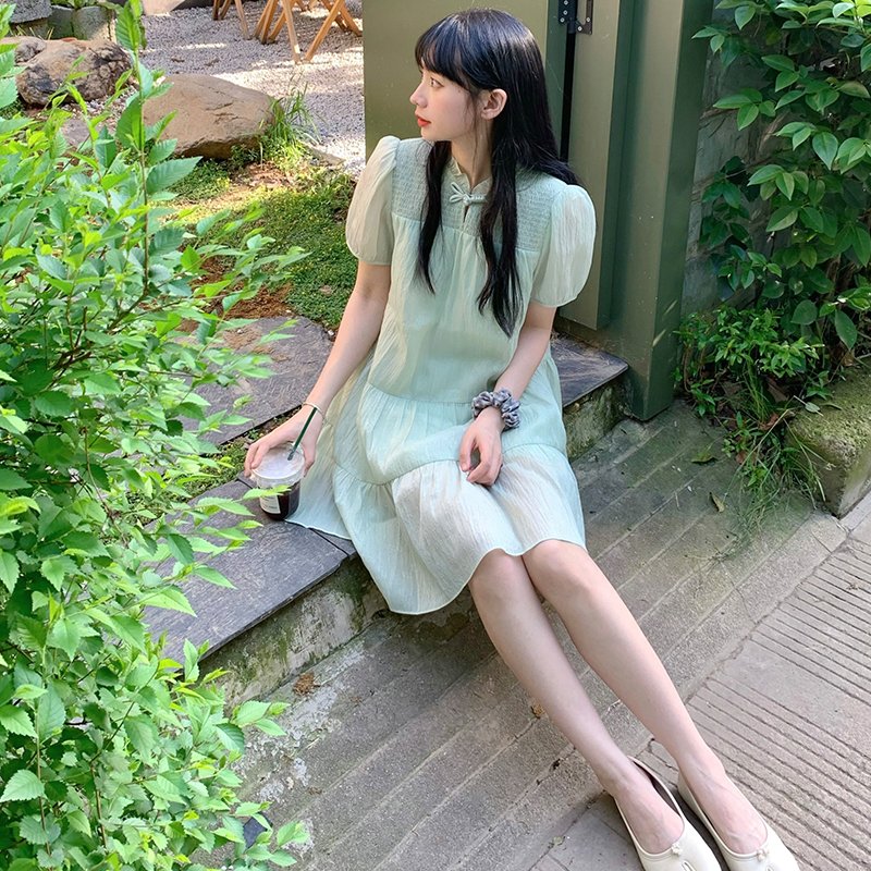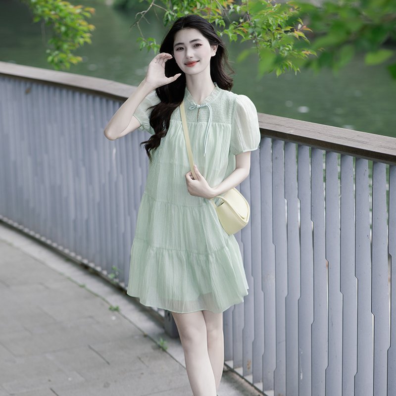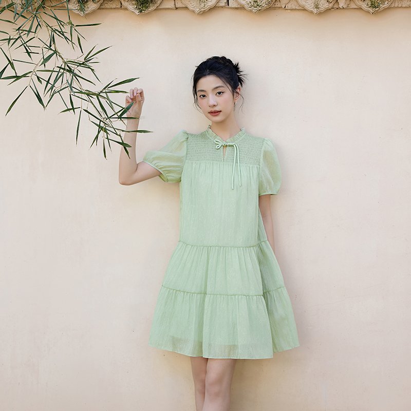 甜美减龄新中式娃娃连衣裙-面料蓬松柔软的甜美连衣裙 ,前肩打缆设计 ,柔和又有力支撑裙身。 飘逸的娃娃裙型十分减龄 ,点缀国风盘扣 重新诠释新中式风格。
