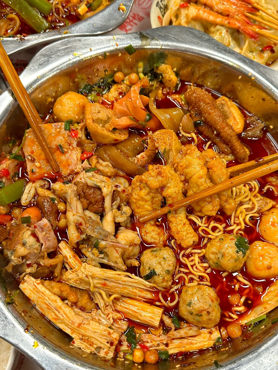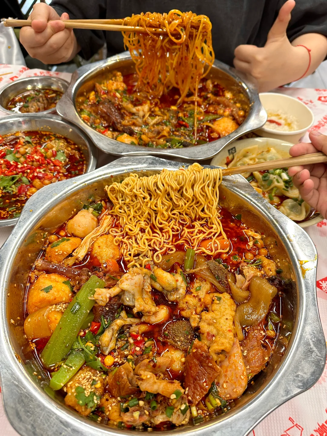 被长沙本地朋友带路来吃的小破店震撼到了😭!!怎么会这么多人啊啊啊!!(叫来冒来) 和朋友排队两小时,果然没失望!!锅底都是每天现熬,毛肚、虾滑、酥肉、千层肚、凤爪…冒什么都好好啊🥹!!还有蒜蓉酱、辣椒粉2种搭配着吃,味道好正宗~ 唯一缺点:太多人了记得早点去吃!!