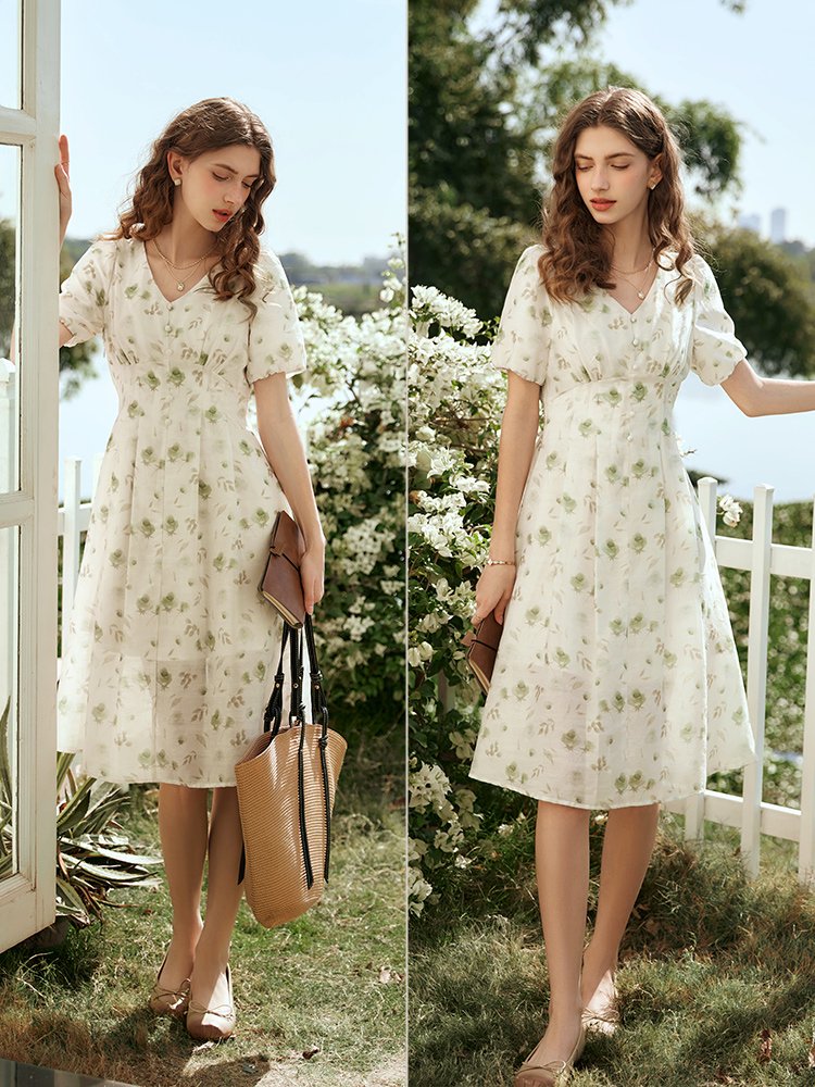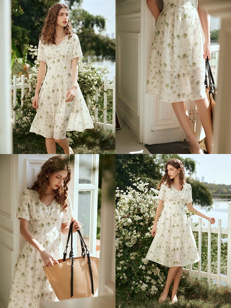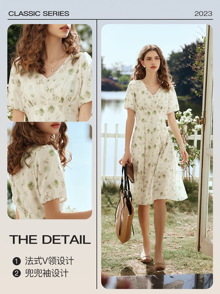 V领设计凸显纤长天鹅颈,秀出精至锁骨线条,前中单排本布包扣点缀,简洁美观,丰富细节感,兜兜袖设计,慵懒松弛感,轻松遮挡拜拜肉,高腰线设计轻松显高,A字压褶裙摆灵动飘逸
