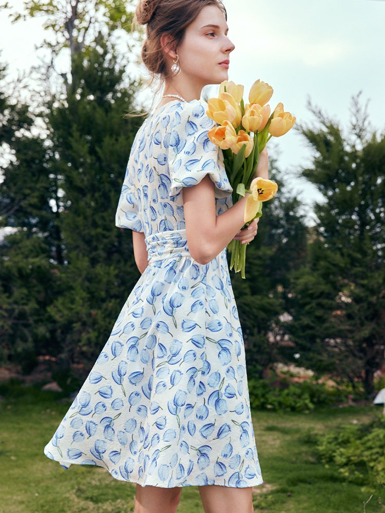 浪漫清新 法式泡泡袖蓝色郁金香提花连衣裙,斜门襟搭片设计,修饰锁骨和颈部线条,花苞型泡泡袖,修饰肩形,遮挡肉肉手臂,腰部做压褶设计,遮住赘肉更有设计感,高腰A字裙摆,飘逸灵动,拉长身材比例