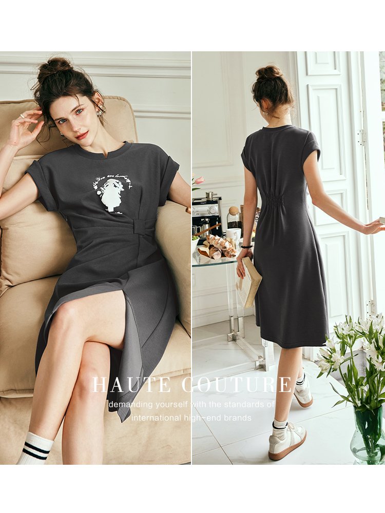 肌理针织料,有型不贴肉,垂坠显瘦,表面肌理感立体,弹力透氣,不易变形,胸前玫瑰女孩剪影印花,精至浪漫,腰节解构设计,遮挡小肚子肉肉,裙摆前侧开叉,行走自如,显腿长