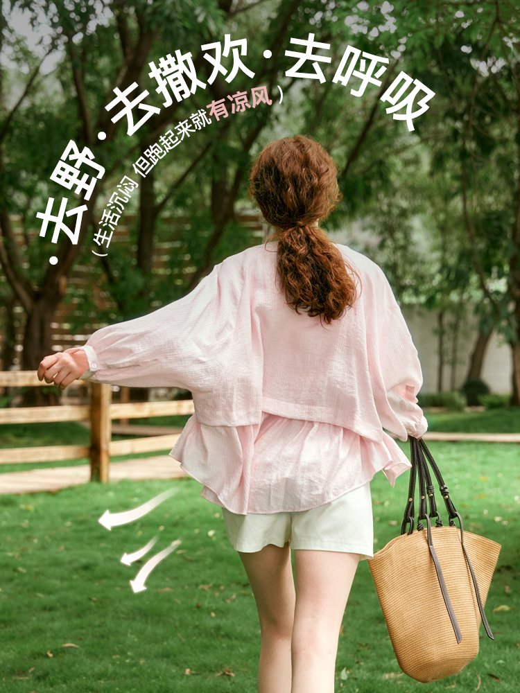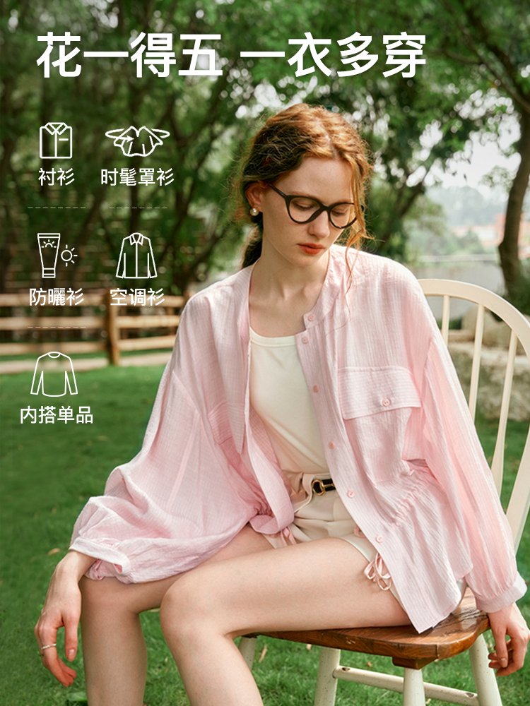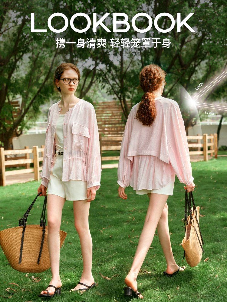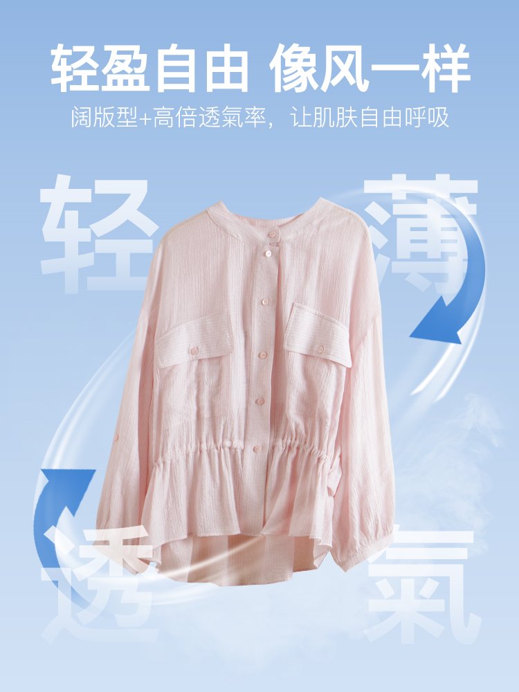 肌理时装料,轻薄透氣,可做空调衫或防’晒衫,门襟天嘫贝壳扣,精至价值感强,穿脱方便,落肩设计柔化肩部线条,显瘦慵懒松弛,前胸翻盖大口袋,凸显层次感,立体且实用,袖子内里贴有袖带,可自行调节袖长,一衣多穿,腰节抽绳可调节围度,后幅灵动搭片凸腰身抬比例