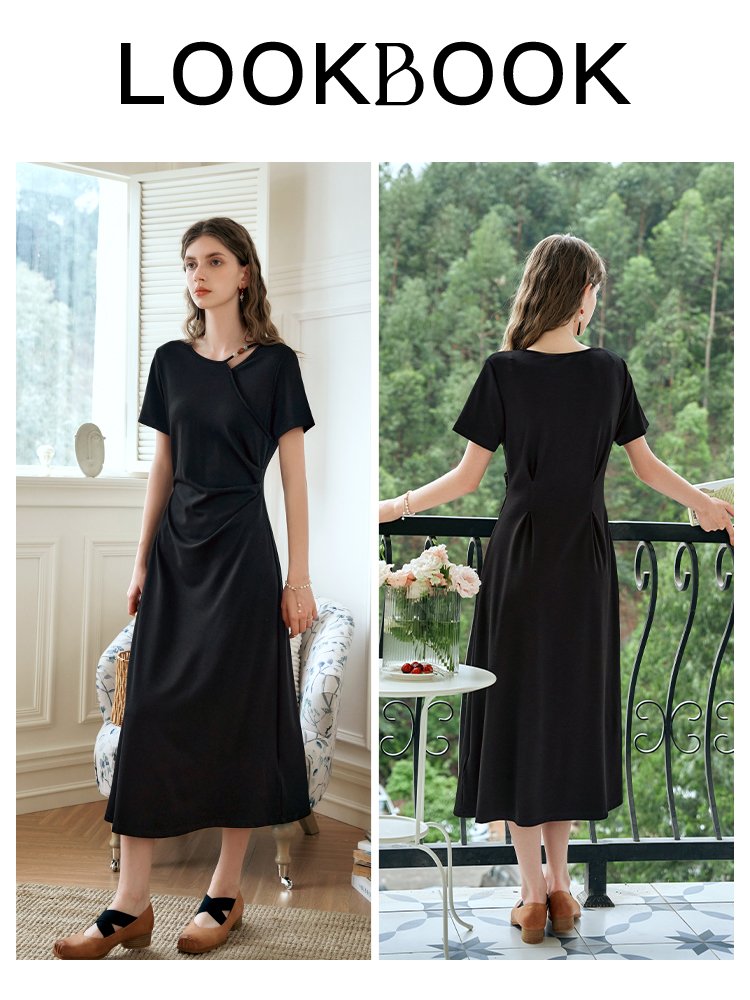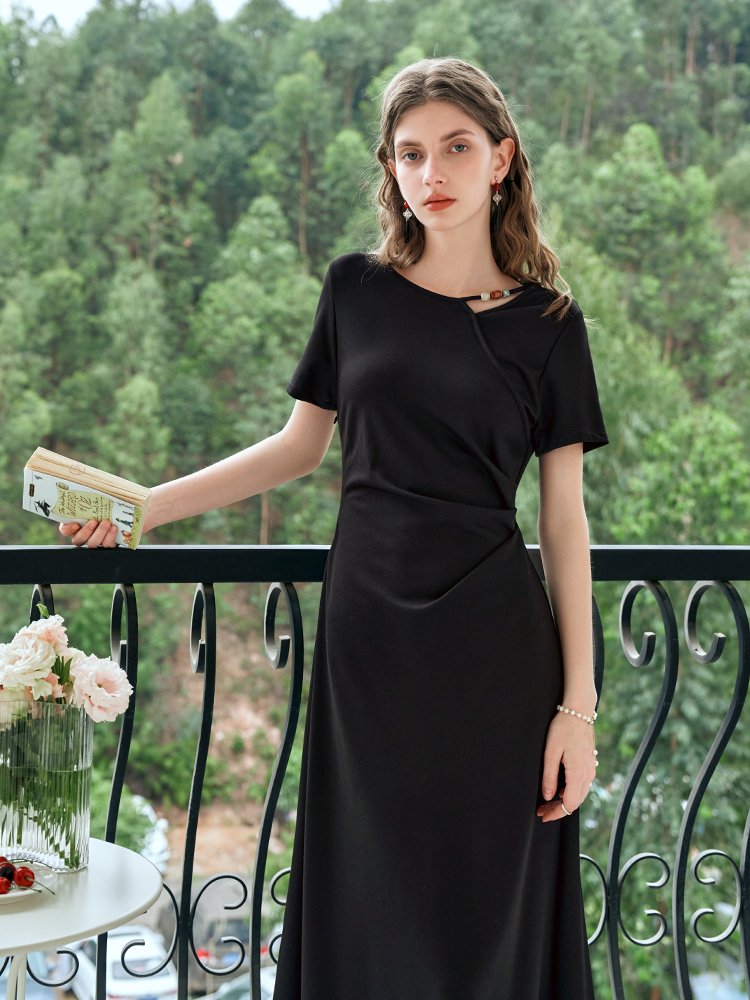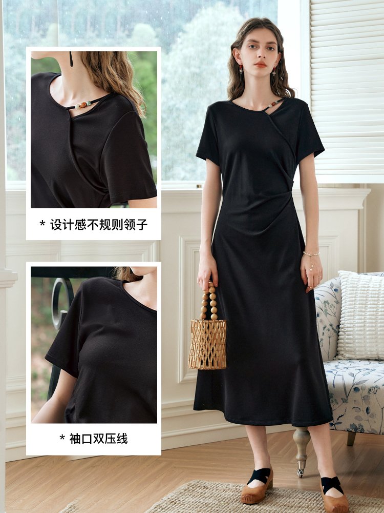 设计感不规则领子,凸显锁骨,显瘦显气质,领口装饰精至彩色珠子,别致吸睛,增添趣味感,腰节收褶处理,恰到好处遮肉,丰富层次感,适中裙长凸显气质,好穿不压个,各种身高好驾驭